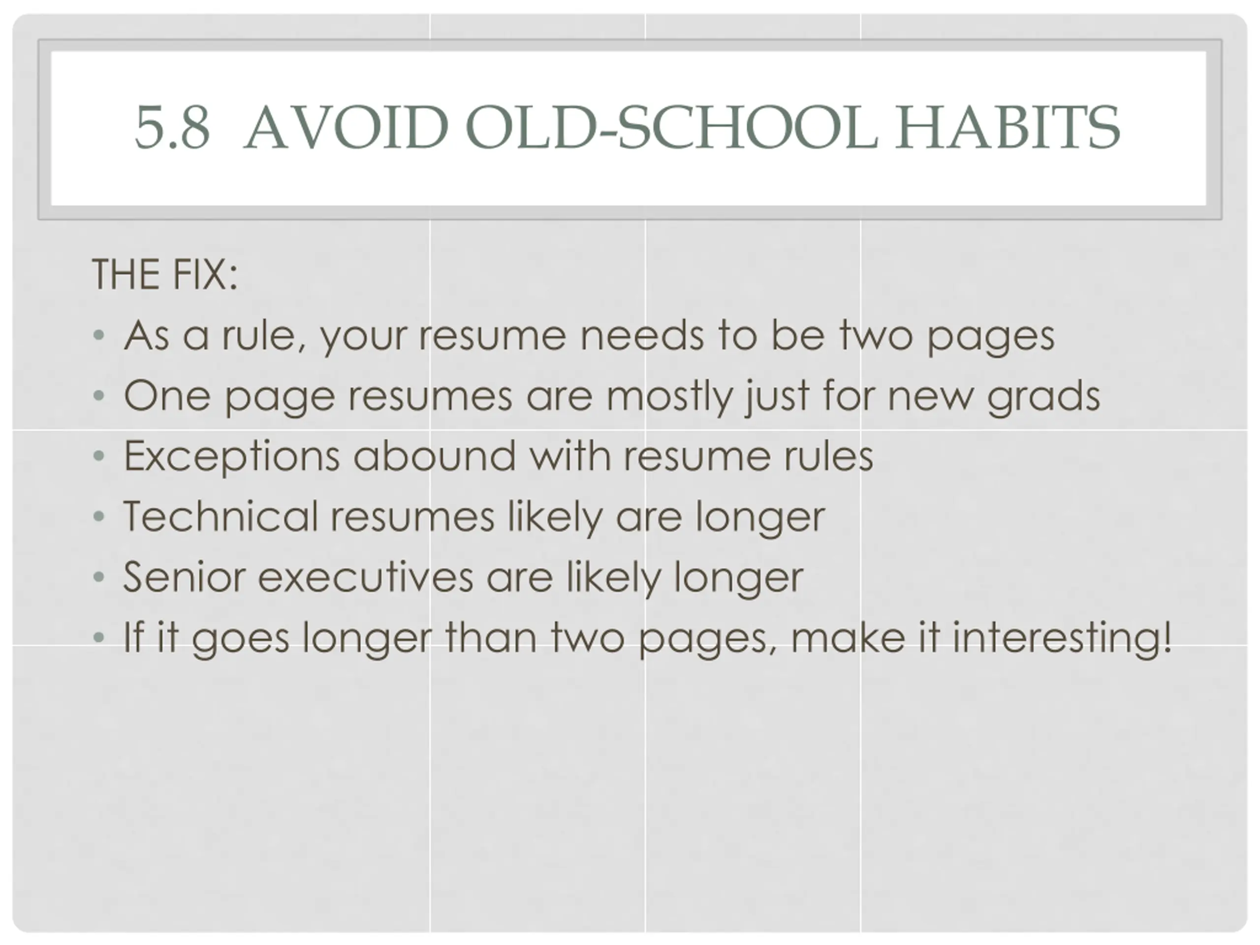 5.8 AVOID OLD-SCHOOL HABITS THE FIX: As a rule, your resume needs to be two pages One page resumes are mostly just for new grads Exceptions abound with resume rules Technical resumes likely are longer Senior executives are likely longer If it goes longer than two pages, make it interesting!