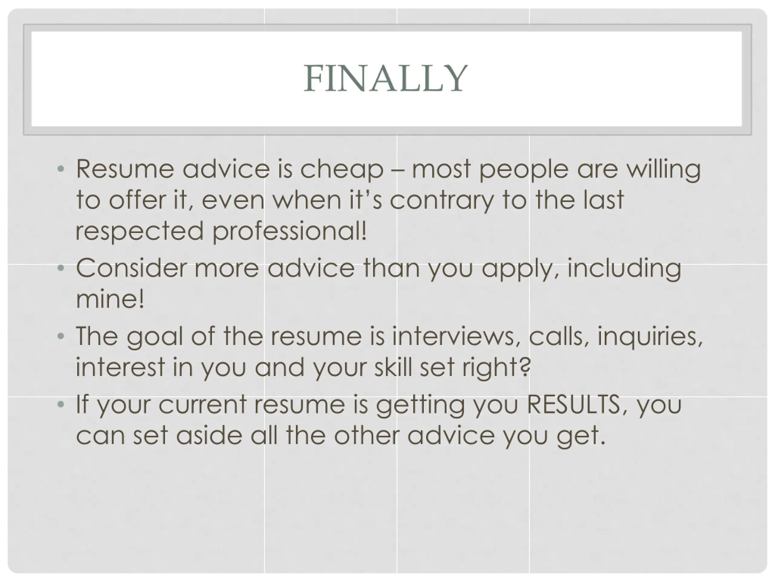 FINALLY Resume advice is cheap most people are willing to offer it, even when it s contrary to the last respected professional! Consider more advice than you apply, including mine! The goal of the resume is interviews, calls, inquiries, interest in you and your skill set right? If your current resume is getting you RESULTS, you can set aside all the other advice you get.