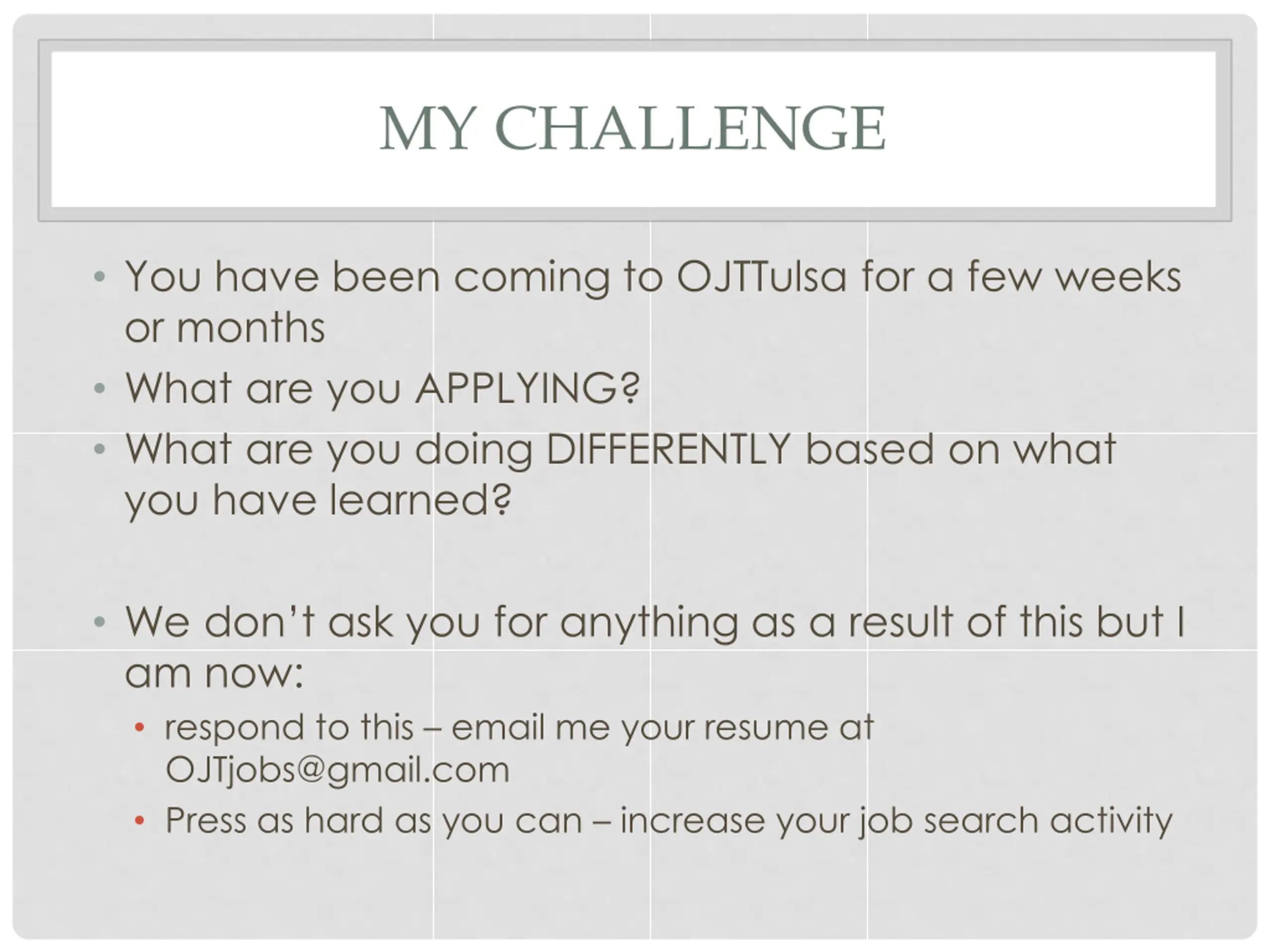 MY CHALLENGE You have been coming to OJTTulsa for a few weeks or months What are you APPLYING? What are you doing DIFFERENTLY based on what you have learned? We don t ask you for anything as a result of this but I am now: respond to this email me your resume at OJTjobs@gmail.com Press as hard as you can increase your job search activity