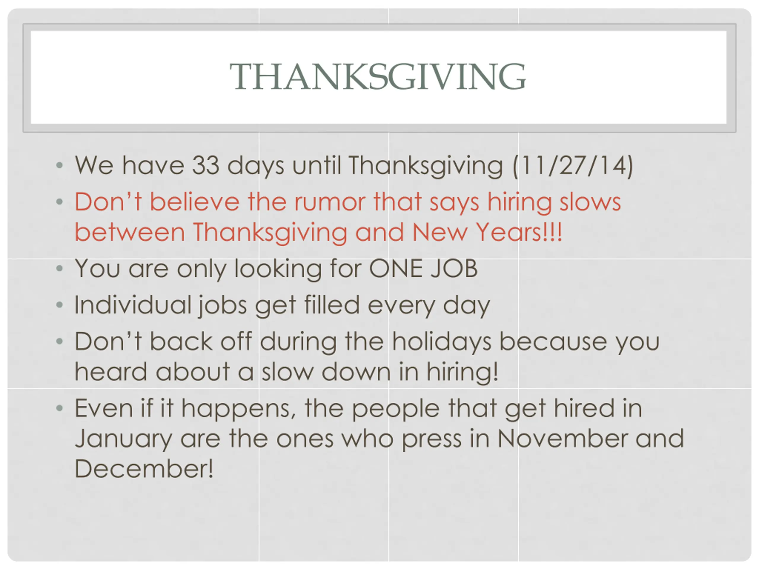 THANKSGIVING We have 33 days until Thanksgiving (11/27/14) Don t believe the rumor that says hiring slows between Thanksgiving and New Years!!! You are only looking for ONE JOB Individual jobs get filled every day Don t back off during the holidays because you heard about a slow down in hiring! Even if it happens, the people that get hired in January are the ones who press in November and December!
