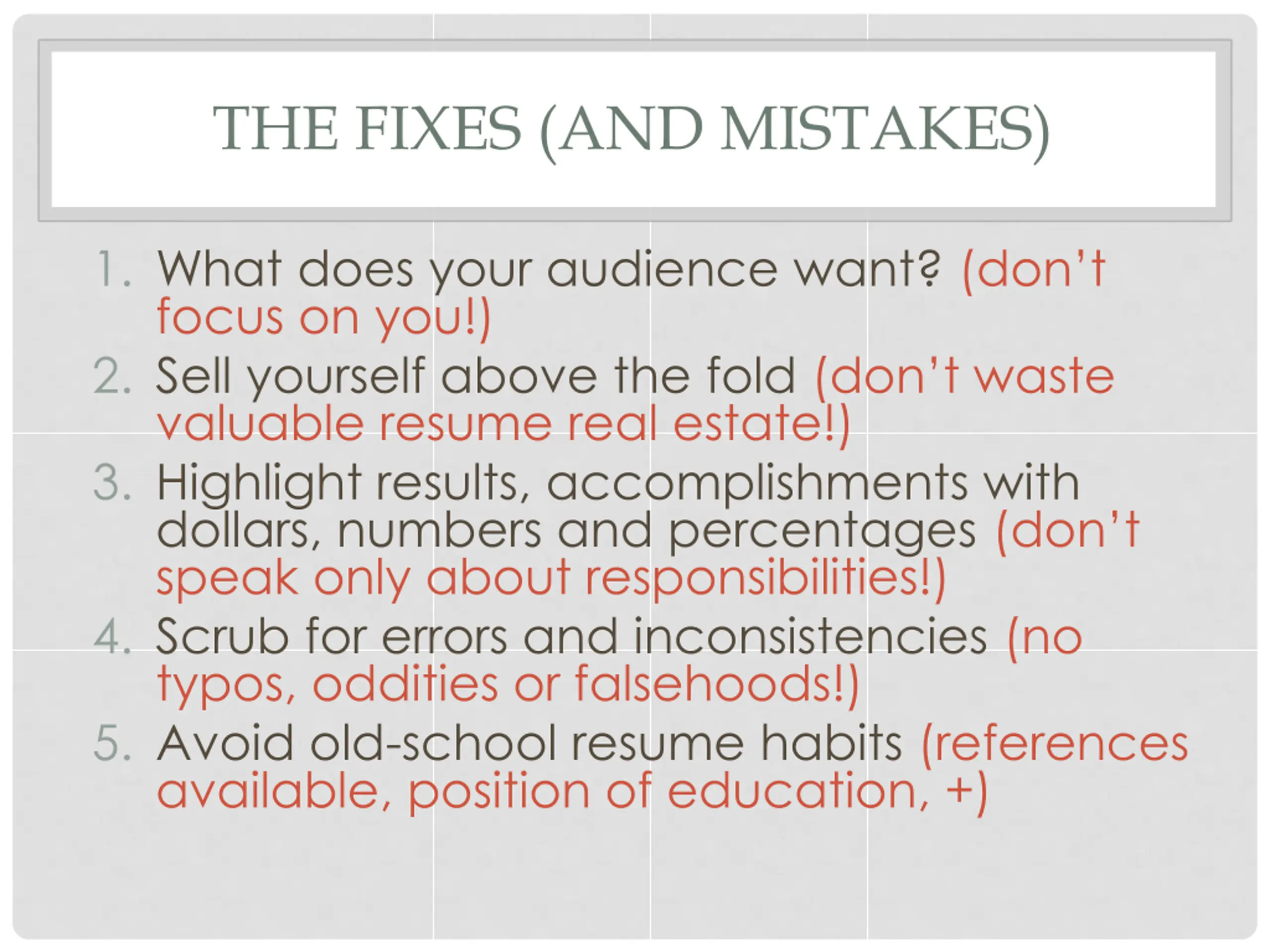THE FIXES (AND MISTAKES) 1. What does your audience want? (don t focus on you!) 2. Sell yourself above the fold (don t waste valuable resume real estate!) 3. Highlight results, accomplishments with dollars, numbers and percentages (don t speak only about responsibilities!) 4. Scrub for errors and inconsistencies (no typos, oddities or falsehoods!) 5. Avoid old-school resume habits (references available, position of education, +)