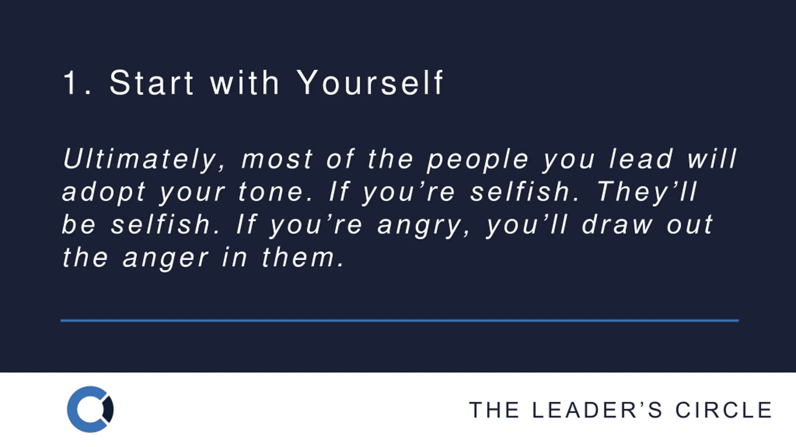 1. Start with Yourself Ultimately, most of the people you lead will adopt your tone. If you re selfish. They ll be selfish. If you re angry, you ll draw out the anger in them. THE LEADER S CIRCLE