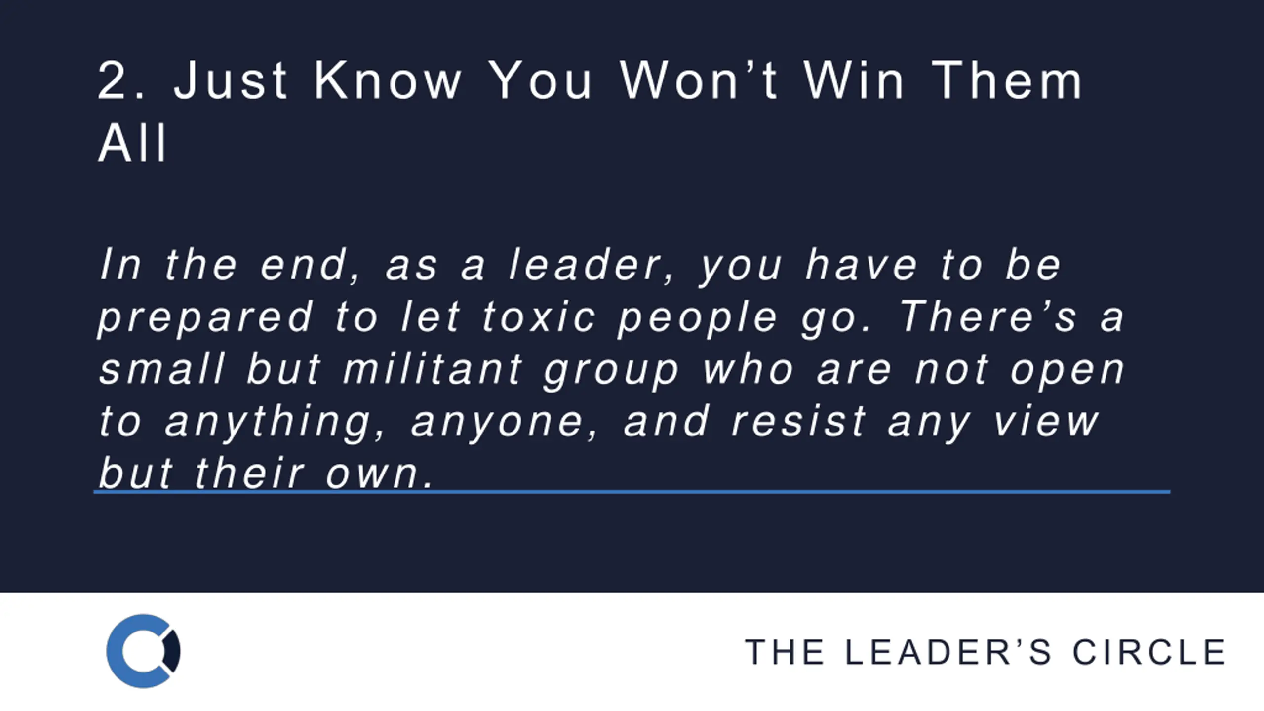 2. Just Know You Wont Win Them All In the end, as a leader, you have to be prepared to let toxic people go. There s a small but militant group who are not open to anything, anyone, and resist any view but their own. THE LEADER S CIRCLE