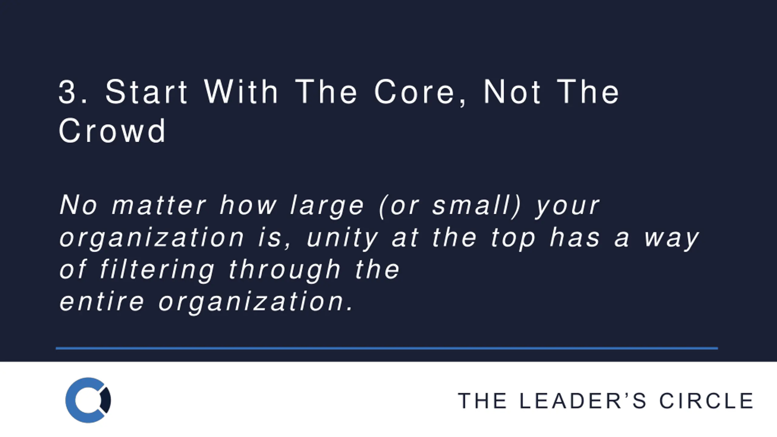 3. Start With The Core, Not The Crowd No matter how large (or small) your organization is, unity at the top has a way of filtering through the entire organization. THE LEADER S CIRCLE