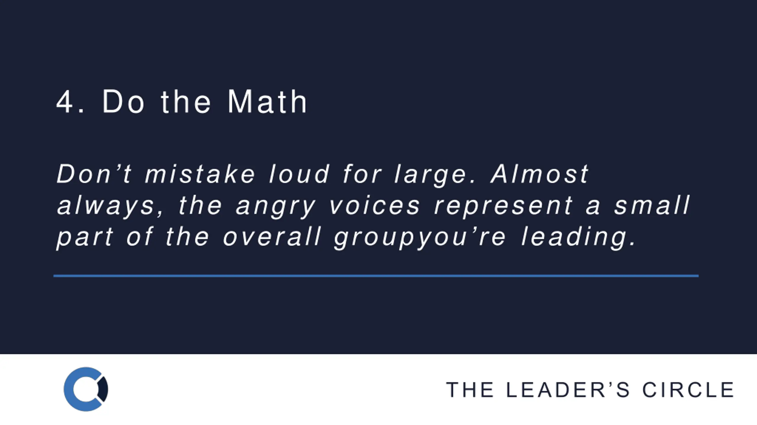 4. Do the Math Don t mistake loud for large. Almost always, the angry voices represent a small part of the overall groupyou re leading. THE LEADER S CIRCLE