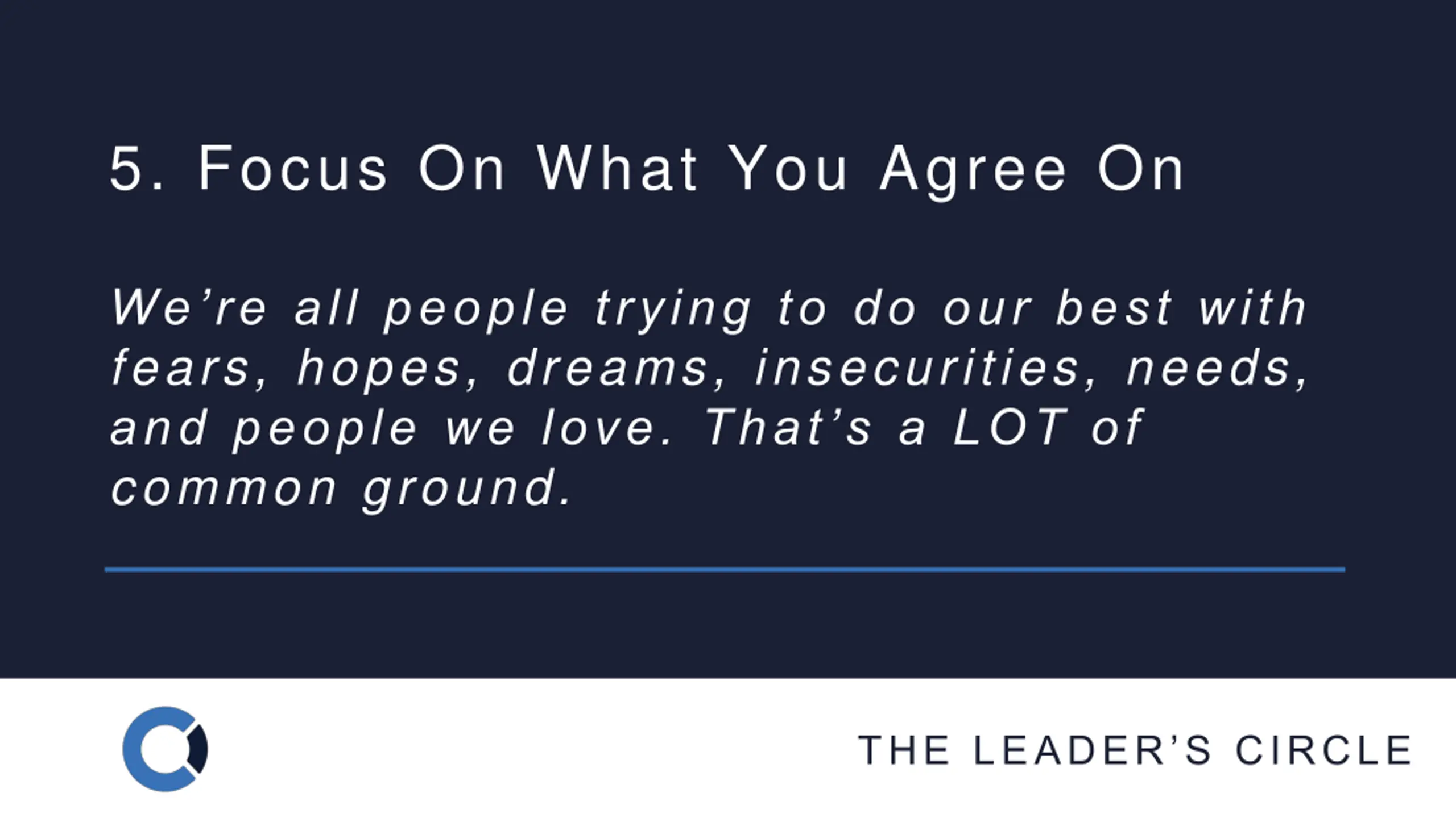 5. Focus On What You Agree On We re all people trying to do our best with fears, hopes, dreams, insecurities, needs, and people we love. That s a LOT of common ground. THE LEADER S CIRCLE