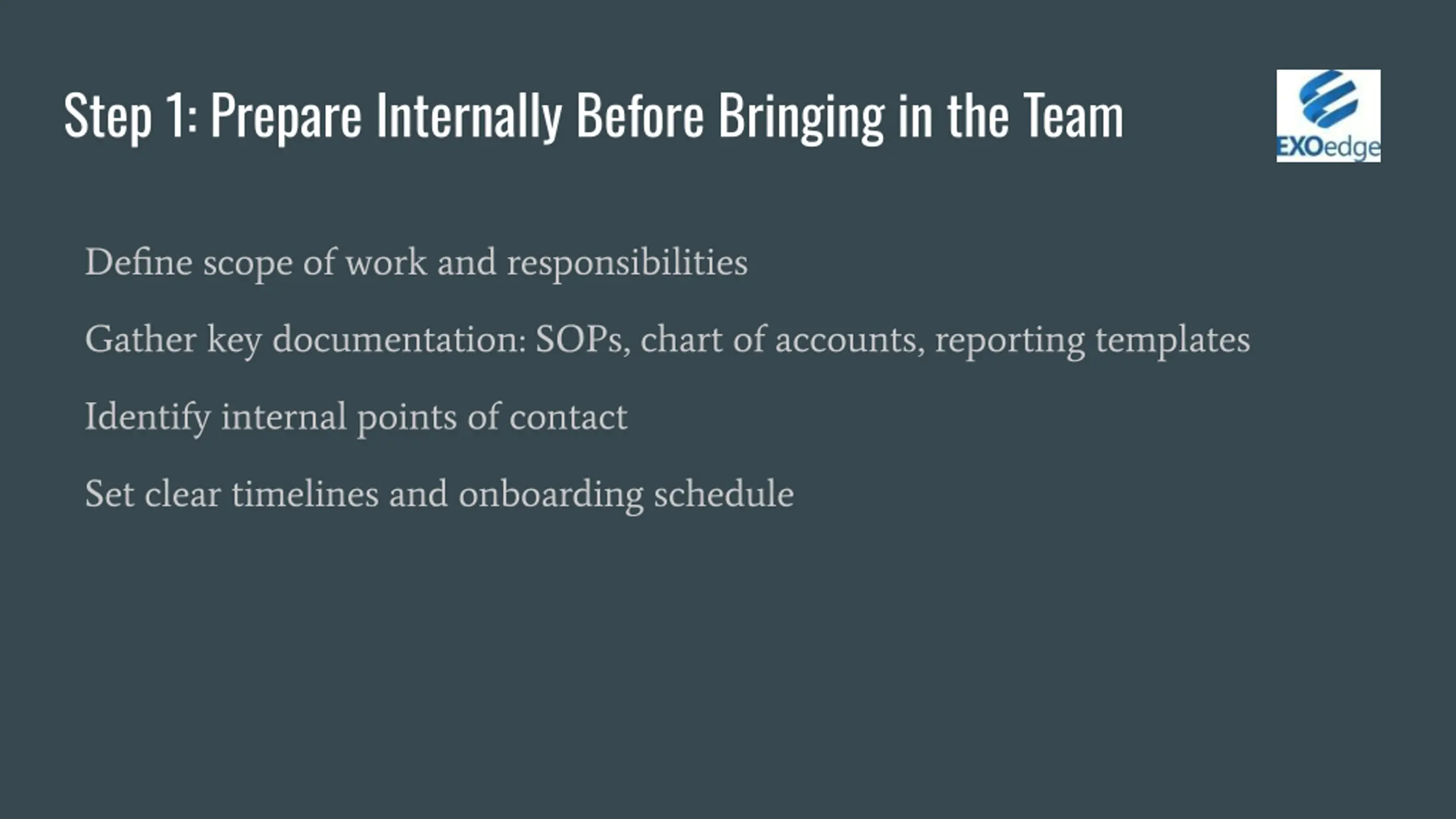 Step 1: Prepare Internally Before Bringing in the Team Define scope of work and responsibilities Gather key documentation: SOPs, chart of accounts, reporting templates Identify internal points of contact Set clear timelines and onboarding schedule