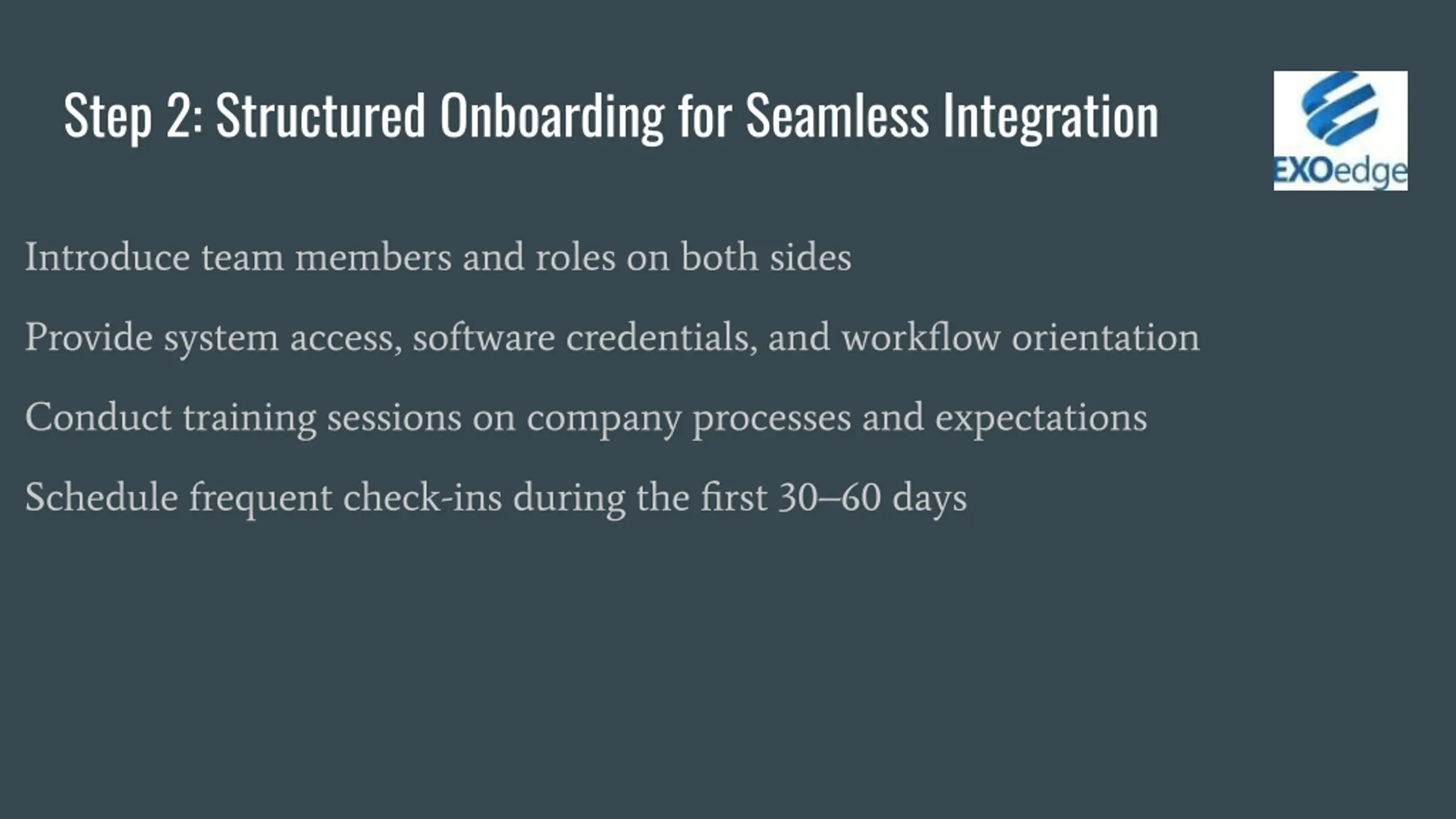 Step 2: Structured Onboarding for Seamless Integration Introduce team members and roles on both sides Provide system access, software credentials, and workflow orientation Conduct training sessions on company processes and expectations Schedule frequent check-ins during the first 30 60 days