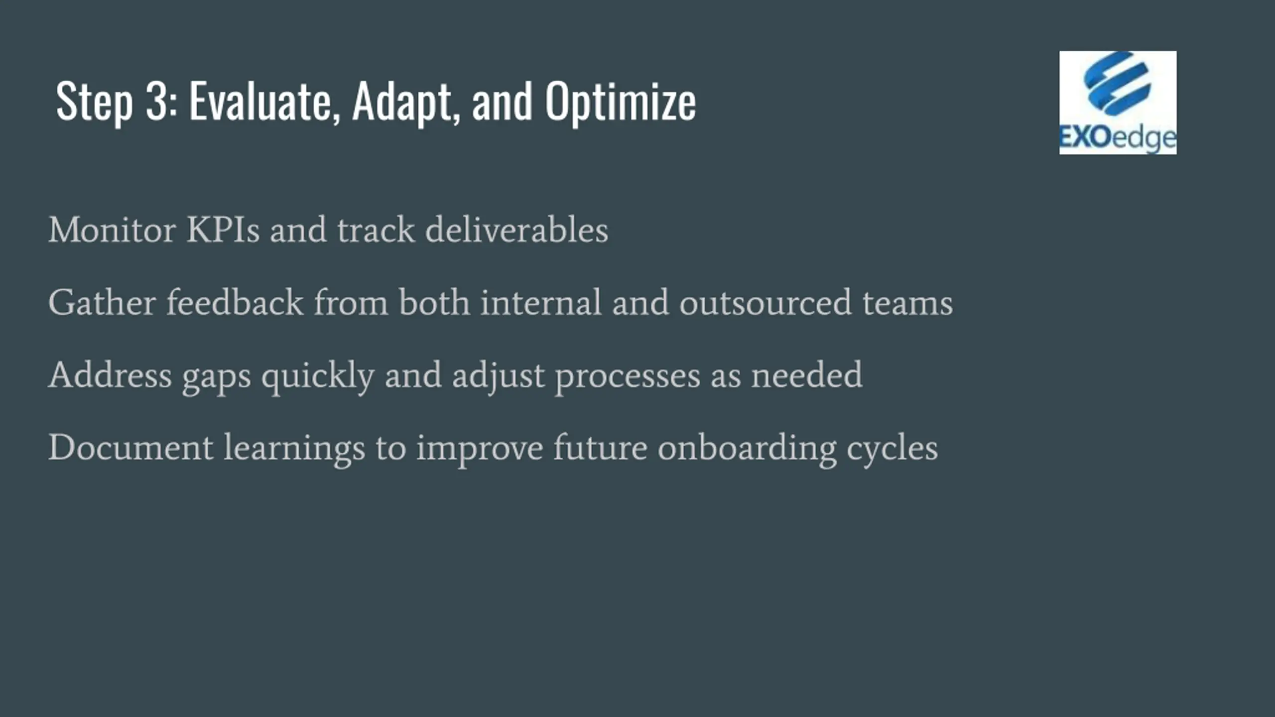 Step 3: Evaluate, Adapt, and Optimize Monitor KPIs and track deliverables Gather feedback from both internal and outsourced teams Address gaps quickly and adjust processes as needed Document learnings to improve future onboarding cycles
