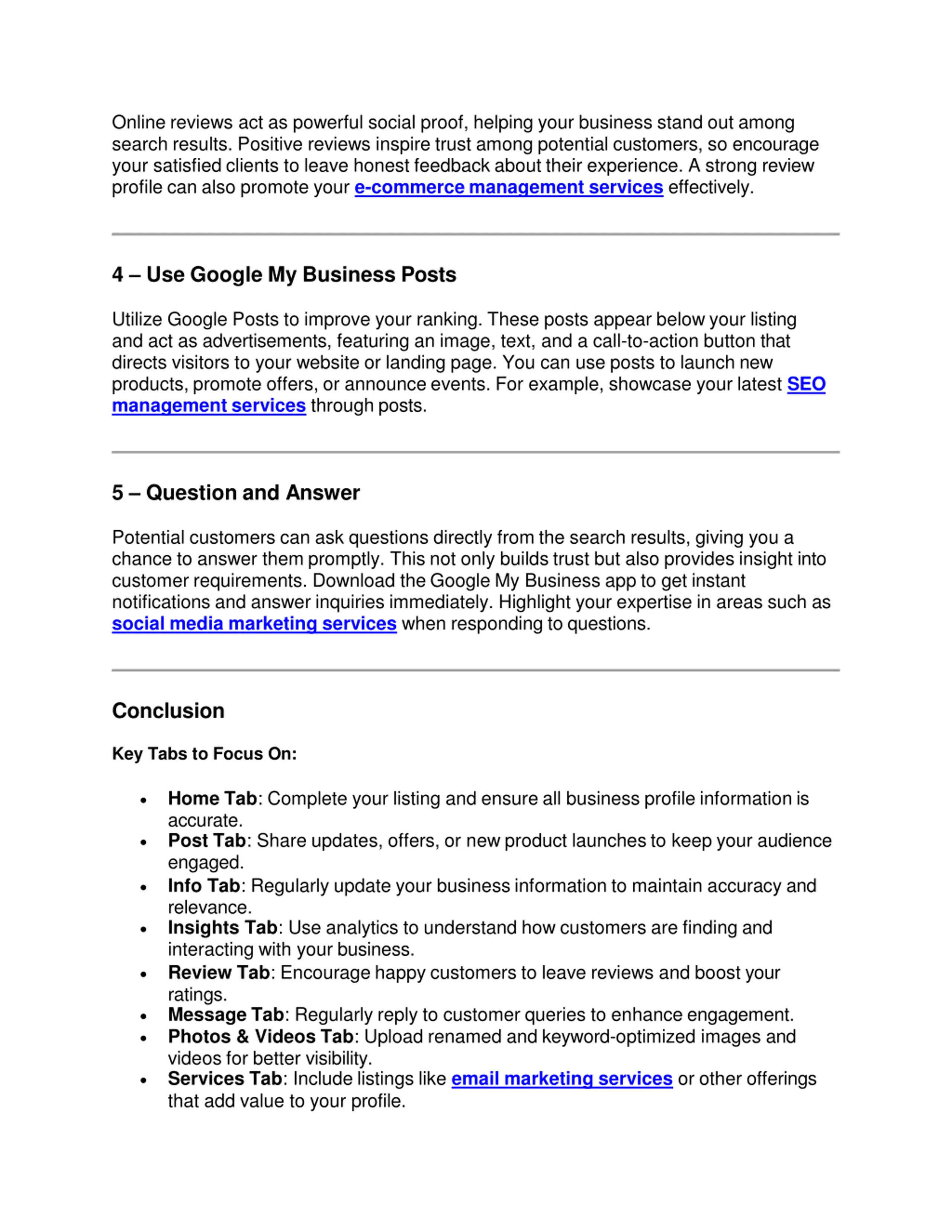 Online reviews act as powerful social proof, helping your business stand out among search results. Positive reviews inspire trust among potential customers, so encourage your satisfied clients to leave honest feedback about their experience. A strong review profile can also promote your e-commerce management services effectively. 4 Use Google My Business Posts Utilize Google Posts to improve your ranking. These posts appear below your listing and act as advertisements, featuring an image, text, and a call-to-action button that directs visitors to your website or landing page. You can use posts to launch new products, promote offers, or announce events. For example, showcase your latest SEO management services through posts. 5 Question and Answer Potential customers can ask questions directly from the search results, giving you a chance to answer them promptly. This not only builds trust but also provides insight into customer requirements. Download the Google My Business app to get instant notifications and answer inquiries immediately. Highlight your expertise in areas such as social media marketing services when responding to questions. Conclusion Key Tabs to Focus On: Home Tab: Complete your listing and ensure all business profile information is accurate. Post Tab: Share updates, offers, or new product launches to keep your audience engaged. Info Tab: Regularly update your business information to maintain accuracy and relevance. Insights Tab: Use analytics to understand how customers are finding and interacting with your business. Review Tab: Encourage happy customers to leave reviews and boost your ratings. Message Tab: Regularly reply to customer queries to enhance engagement. Photos & Videos Tab: Upload renamed and keyword-optimized images and videos for better visibility. Services Tab: Include listings like email marketing services or other offerings that add value to your profile.