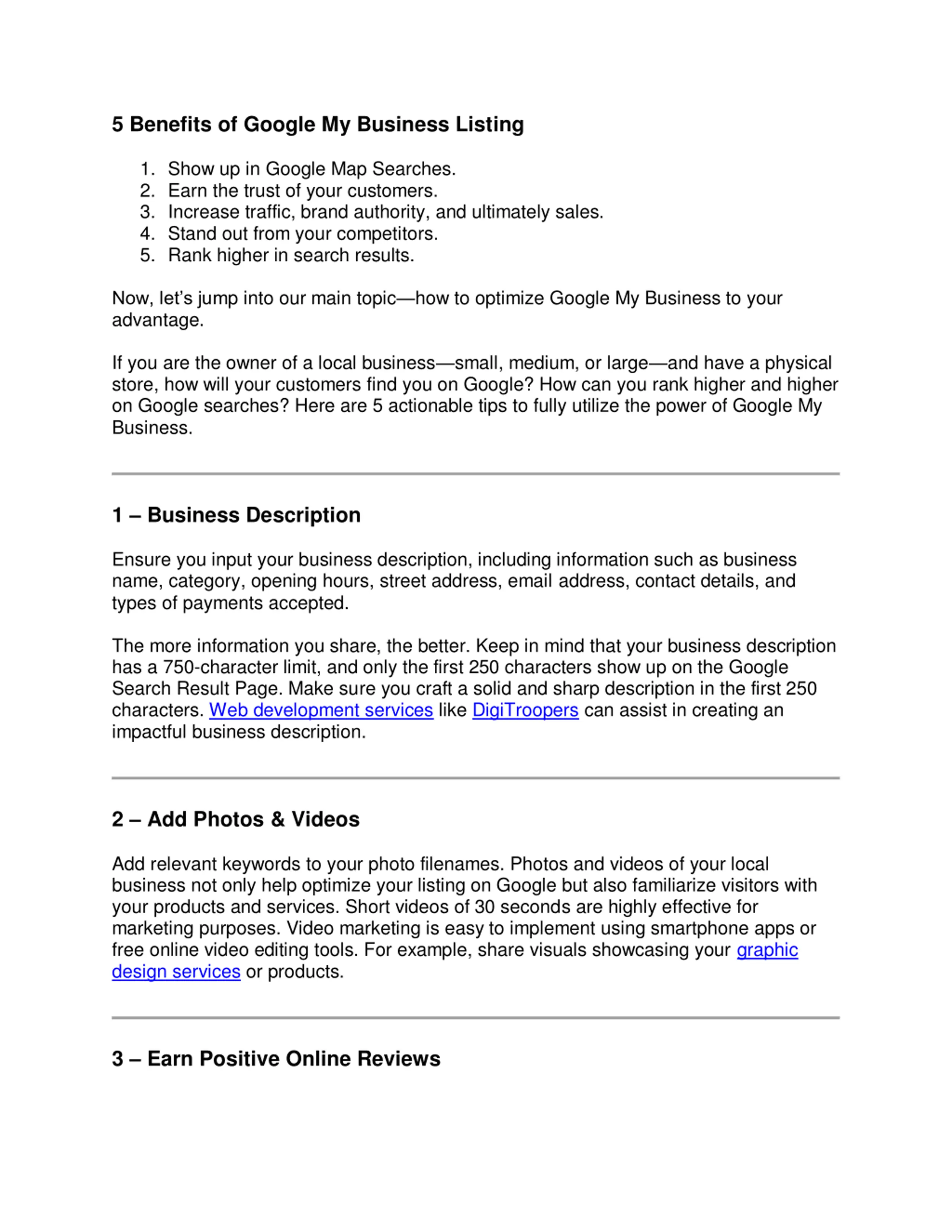5 Benefits of Google My Business Listing 1. Show up in Google Map Searches. 2. Earn the trust of your customers. 3. Increase traffic, brand authority, and ultimately sales. 4. Stand out from your competitors. 5. Rank higher in search results. Now, let s jump into our main topic how to optimize Google My Business to your advantage. If you are the owner of a local business small, medium, or large and have a physical store, how will your customers find you on Google? How can you rank higher and higher on Google searches? Here are 5 actionable tips to fully utilize the power of Google My Business. 1 Business Description Ensure you input your business description, including information such as business name, category, opening hours, street address, email address, contact details, and types of payments accepted. The more information you share, the better. Keep in mind that your business description has a 750-character limit, and only the first 250 characters show up on the Google Search Result Page. Make sure you craft a solid and sharp description in the first 250 characters. Web development services like DigiTroopers can assist in creating an impactful business description. 2 Add Photos & Videos Add relevant keywords to your photo filenames. Photos and videos of your local business not only help optimize your listing on Google but also familiarize visitors with your products and services. Short videos of 30 seconds are highly effective for marketing purposes. Video marketing is easy to implement using smartphone apps or free online video editing tools. For example, share visuals showcasing your graphic design services or products. 3 Earn Positive Online Reviews