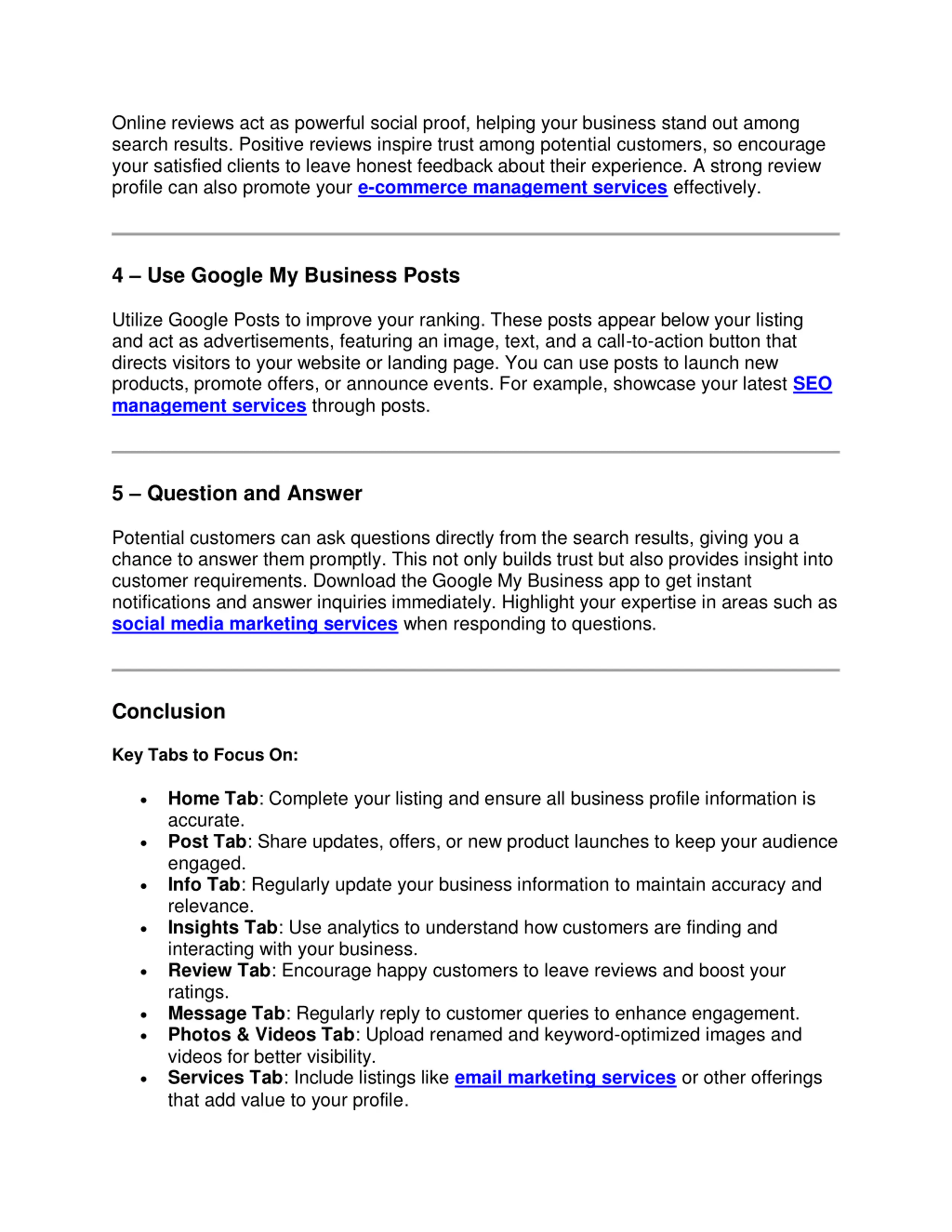 Online reviews act as powerful social proof, helping your business stand out among search results. Positive reviews inspire trust among potential customers, so encourage your satisfied clients to leave honest feedback about their experience. A strong review profile can also promote your e-commerce management services effectively. 4 Use Google My Business Posts Utilize Google Posts to improve your ranking. These posts appear below your listing and act as advertisements, featuring an image, text, and a call-to-action button that directs visitors to your website or landing page. You can use posts to launch new products, promote offers, or announce events. For example, showcase your latest SEO management services through posts. 5 Question and Answer Potential customers can ask questions directly from the search results, giving you a chance to answer them promptly. This not only builds trust but also provides insight into customer requirements. Download the Google My Business app to get instant notifications and answer inquiries immediately. Highlight your expertise in areas such as social media marketing services when responding to questions. Conclusion Key Tabs to Focus On: Home Tab: Complete your listing and ensure all business profile information is accurate. Post Tab: Share updates, offers, or new product launches to keep your audience engaged. Info Tab: Regularly update your business information to maintain accuracy and relevance. Insights Tab: Use analytics to understand how customers are finding and interacting with your business. Review Tab: Encourage happy customers to leave reviews and boost your ratings. Message Tab: Regularly reply to customer queries to enhance engagement. Photos & Videos Tab: Upload renamed and keyword-optimized images and videos for better visibility. Services Tab: Include listings like email marketing services or other offerings that add value to your profile.