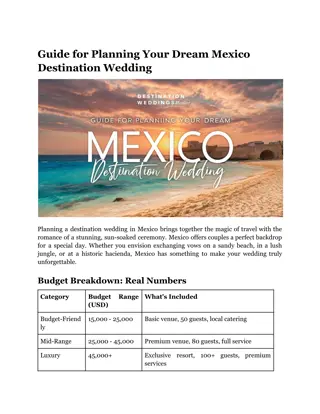 Indoor backup locations Flexible rescheduling policies Time of Day Considerations Mexican wedding ceremonies traditionally start later than their U.S. counterparts, with most beginning between 4:00 PM and 6:00 PM. This timing allows temperatures to cool and creates optimal lighting conditions for photography. Reception celebrations often continue until midnight or later, aligning with local customs and helping guests adjust to the relaxed Mexican atmosphere. Venues and Packages in Mexico Resort Wedding Packages Standard resort packages in Mexico typically cover essential elements while allowing customization. Base packages usually start at $2,000 and include: Ceremony and reception spaces Basic d cor and floral arrangements Wedding coordinator services Menu options for up to 30 guests Basic photography coverage Beyond Standard Resorts Boutique hotels and private villas present unique alternatives to traditional resort weddings. These venues often provide more flexibility in vendor selection and customization options. Private villas particularly suit smaller weddings of 50-75 guests, offering multi-day celebration possibilities and complete privacy. Venue Selection Strategy When evaluating venues, consider their experience with international weddings. Established properties should provide: Clear relationships Detailed weather contingency plans Experience with international paperwork communication protocols Bilingual coordination services Proven vendor