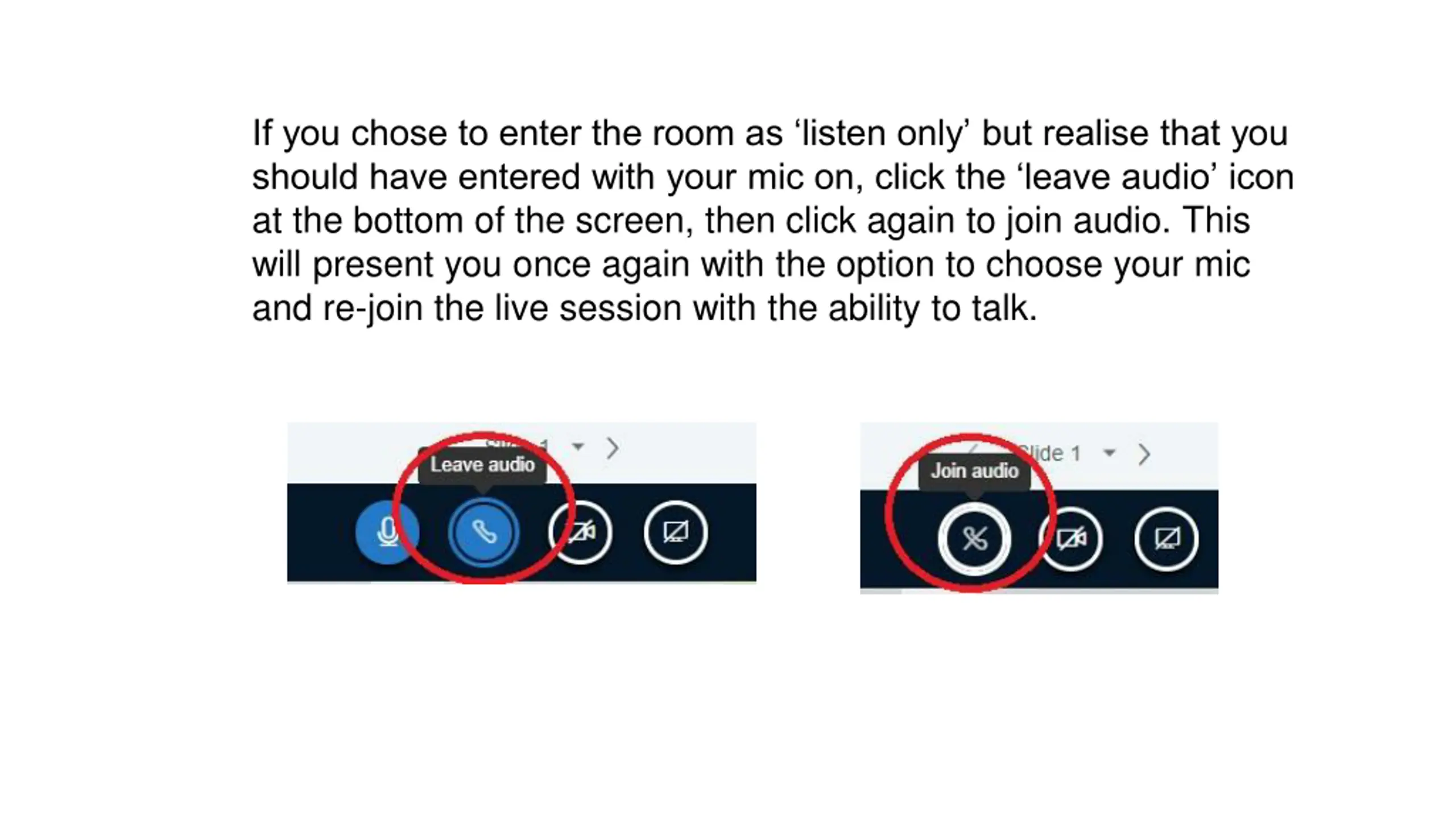 If you chose to enter the room as listen only but realise that you should have entered with your mic on, click the leave audio icon at the bottom of the screen, then click again to join audio. This will present you once again with the option to choose your mic and re-join the live session with the ability to talk.