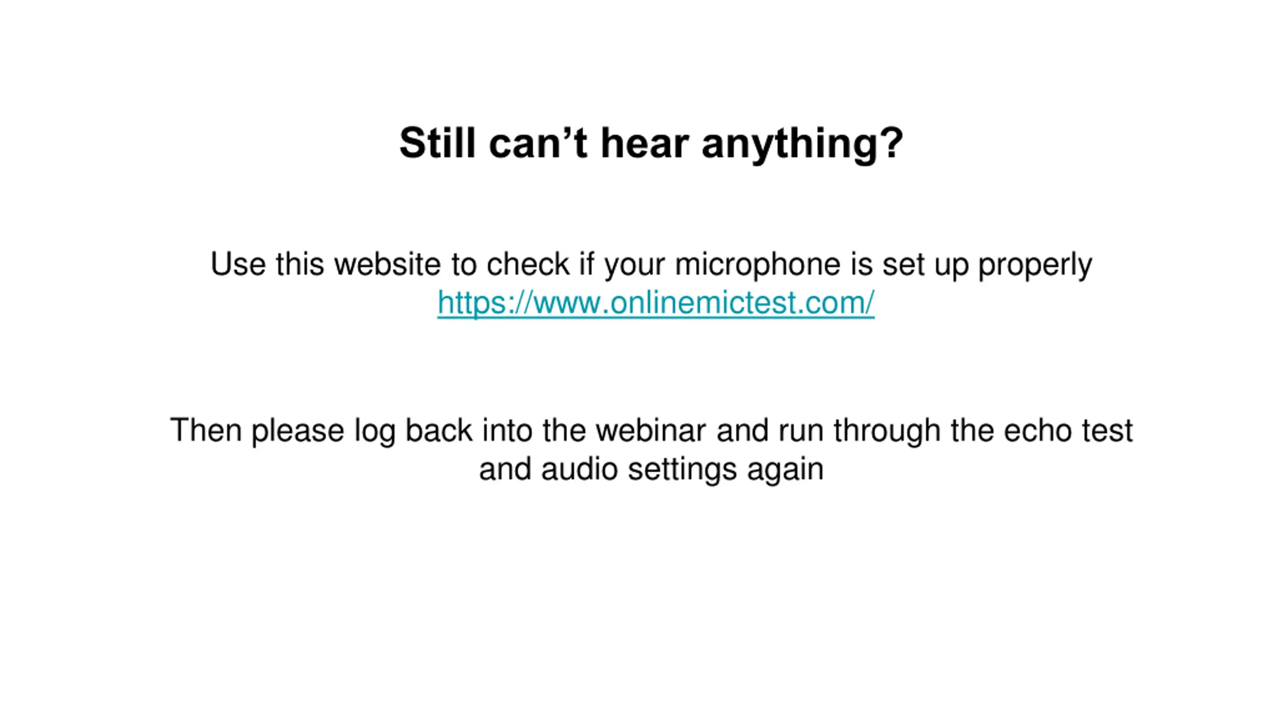 Still cant hear anything? Use this website to check if your microphone is set up properly https://www.onlinemictest.com/ Then please log back into the webinar and run through the echo test and audio settings again