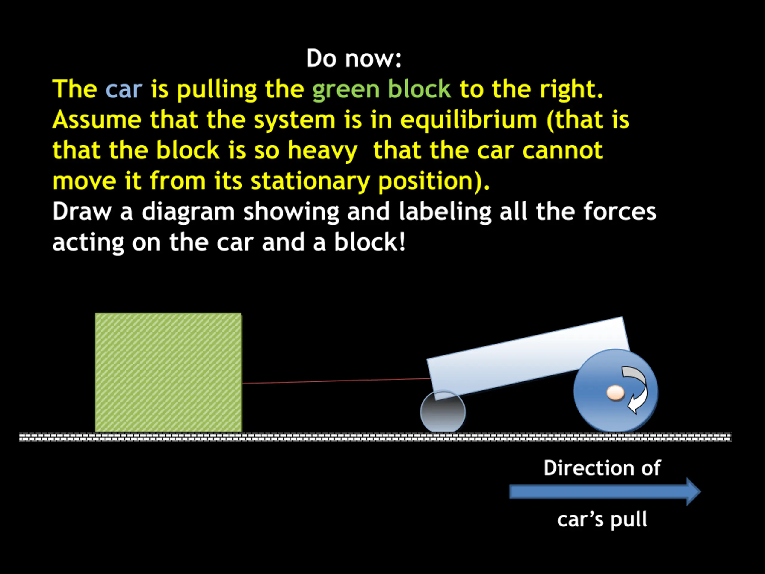 Do now: The car is pulling the green block to the right. Assume that the system is in equilibrium (that is that the block is so heavy that the car cannot move it from its stationary position). Draw a diagram showing and labeling all the forces acting on the car and a block! Direction of car s pull
