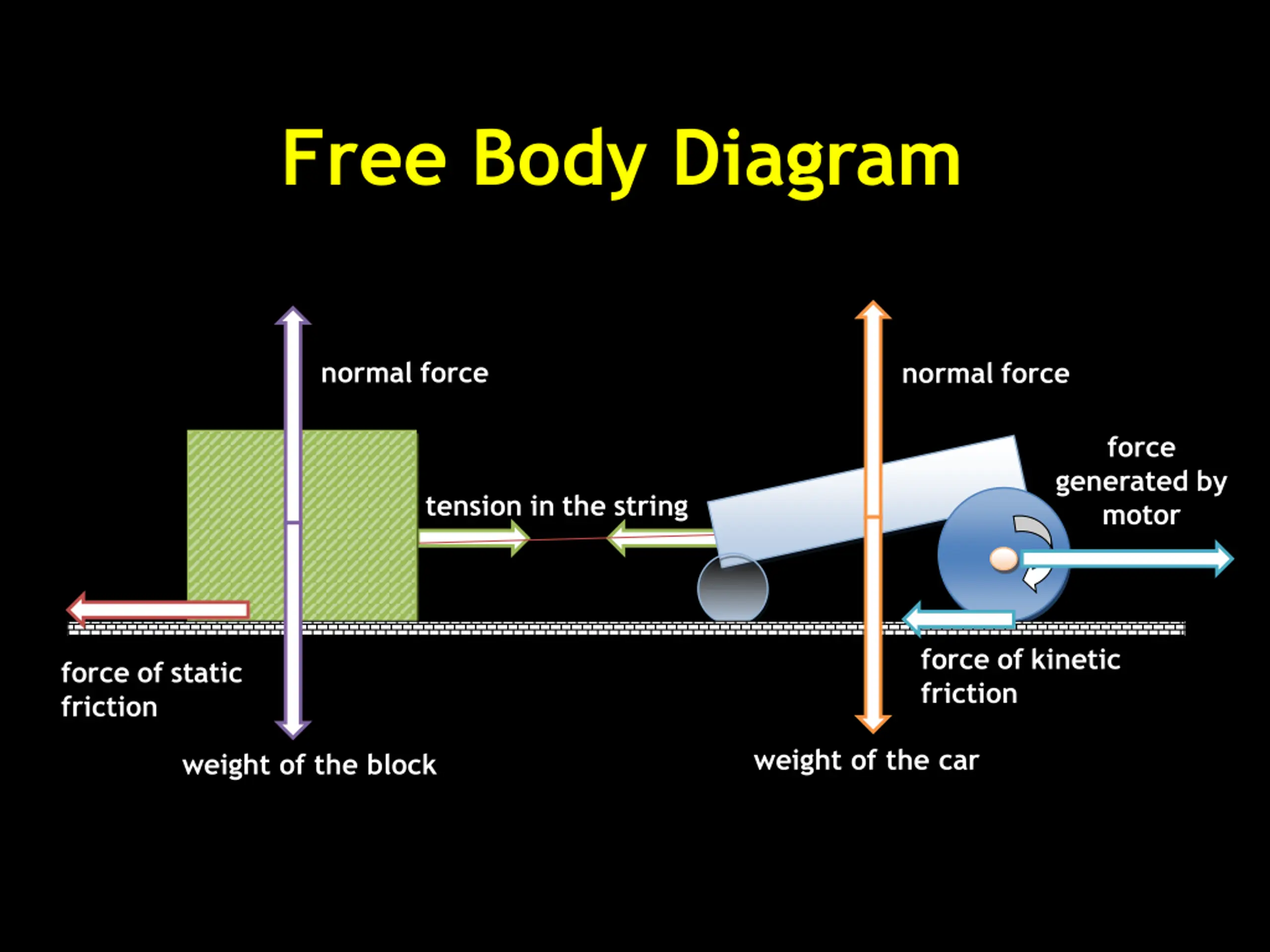 Free Body Diagram normalforce normalforce force generatedby motor tensioninthestring forceofkinetic friction forceofstatic friction weight of the car weight of the block