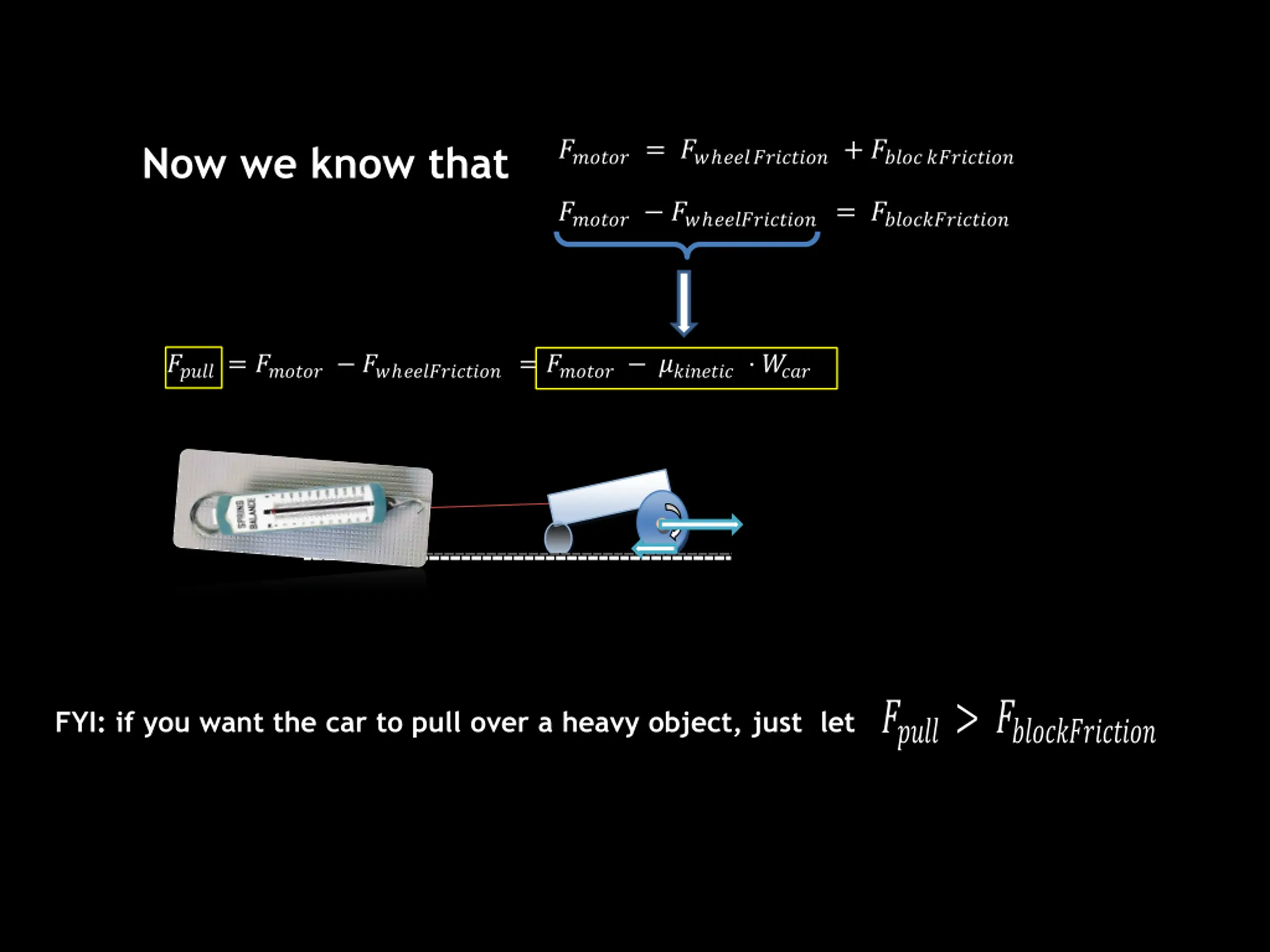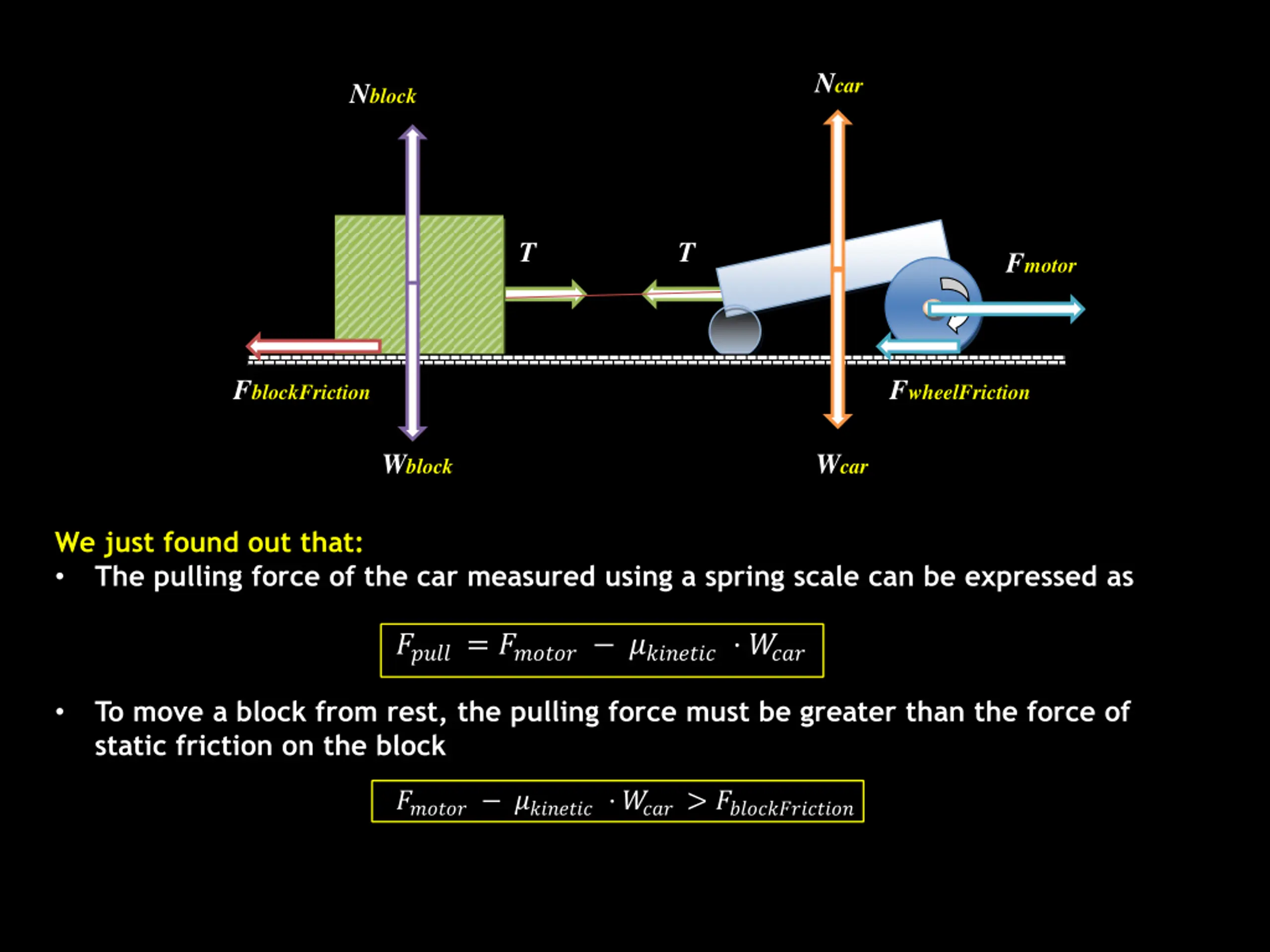 Ncar Nblock T T Fmotor FblockFriction FwheelFriction Wblock Wcar We just found out that: The pulling force of the car measured using a spring scale can be expressed as ?????= ?????? ???????? ???? To move a block from rest, the pulling force must be greater than the force of static friction on the block ?????? ???????? ????> ??????????????