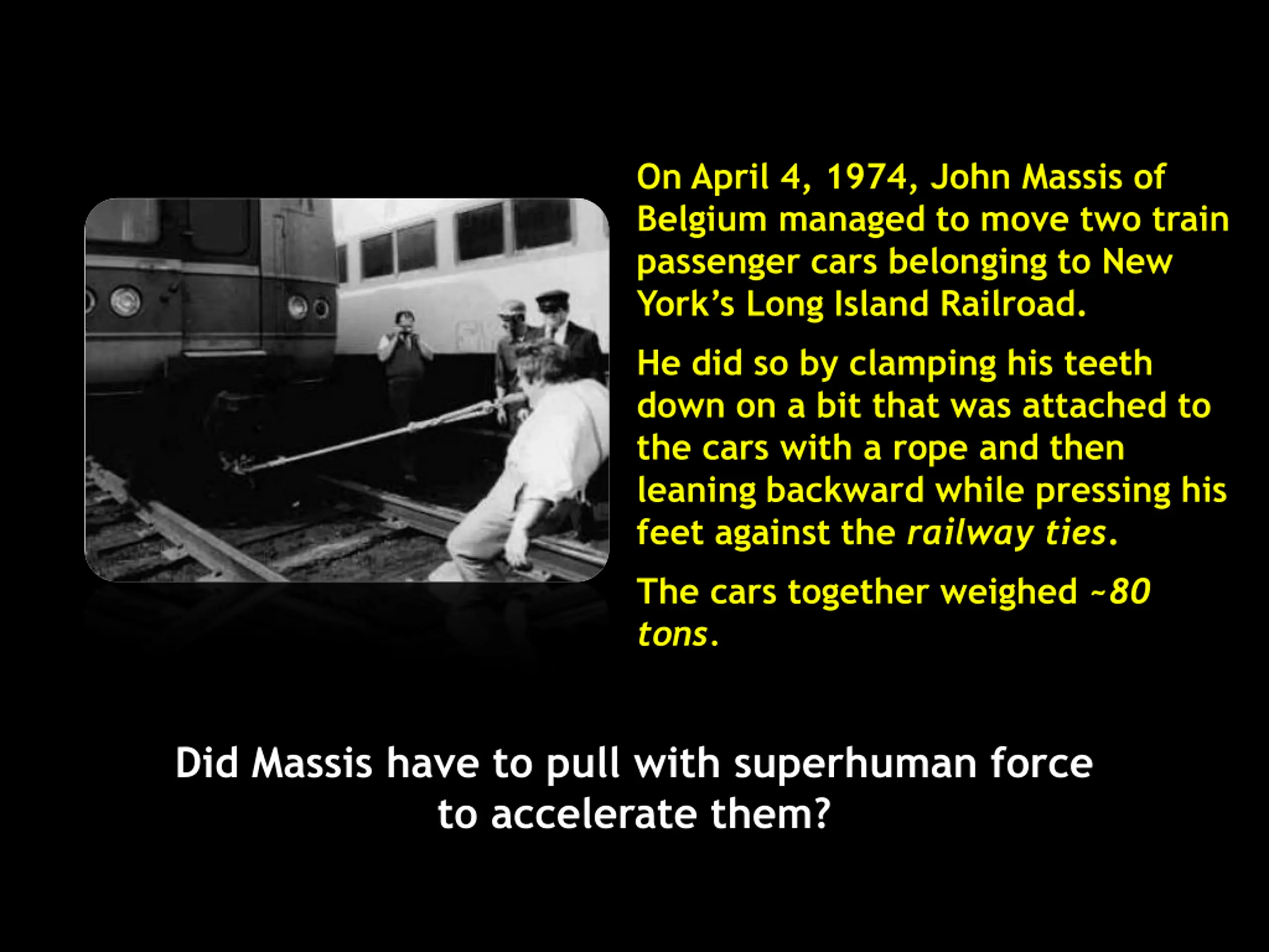 On April 4, 1974, John Massis of Belgium managed to move two train passenger cars belonging to New York s Long Island Railroad. He did so by clamping his teeth down on a bit that was attached to the cars with a rope and then leaning backward while pressing his feet against the railway ties. The cars together weighed ~80 tons. Did Massis have to pull with superhuman force to accelerate them?