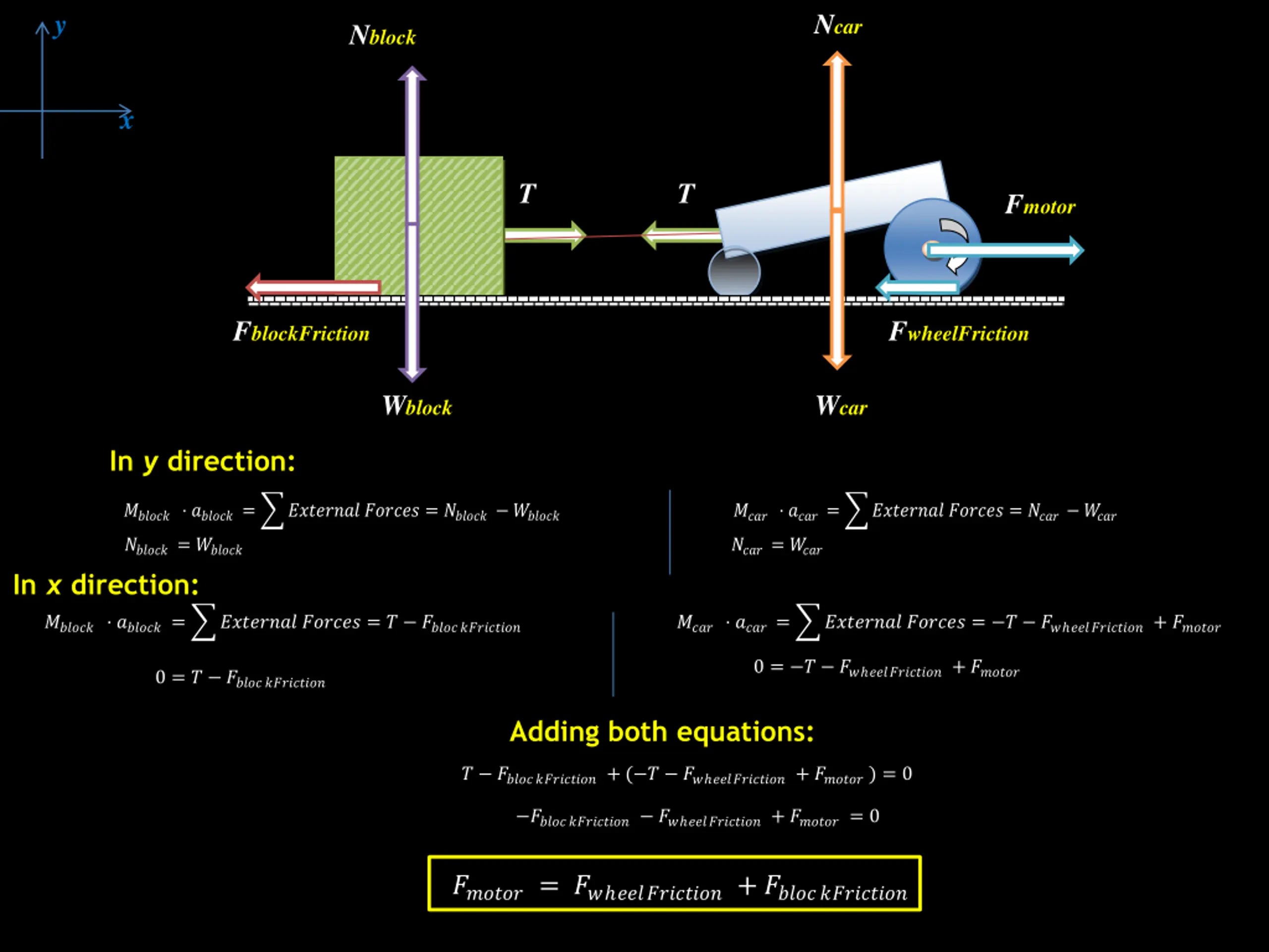 y Ncar Nblock x T T Fmotor FblockFriction FwheelFriction Wblock Wcar In y direction: ?????? ??????= ?????????????? = ?????? ?????? ???? ????= ?????????????? = ???? ???? ??????= ?????? ????= ???? In x direction: ???? ????= ?????????????? = ? ?? ???????????+ ?????? ?????? ??????= ?????????????? = ? ?????????????? 0 = ? ?? ???????????+ ?????? 0 = ? ?????????????? Adding both equations: ? ??????????????+ ( ? ?? ???????????+ ??????) = 0 ?????????????? ?? ???????????+ ??????= 0 ??????= ?? ???????????+ ??????????????