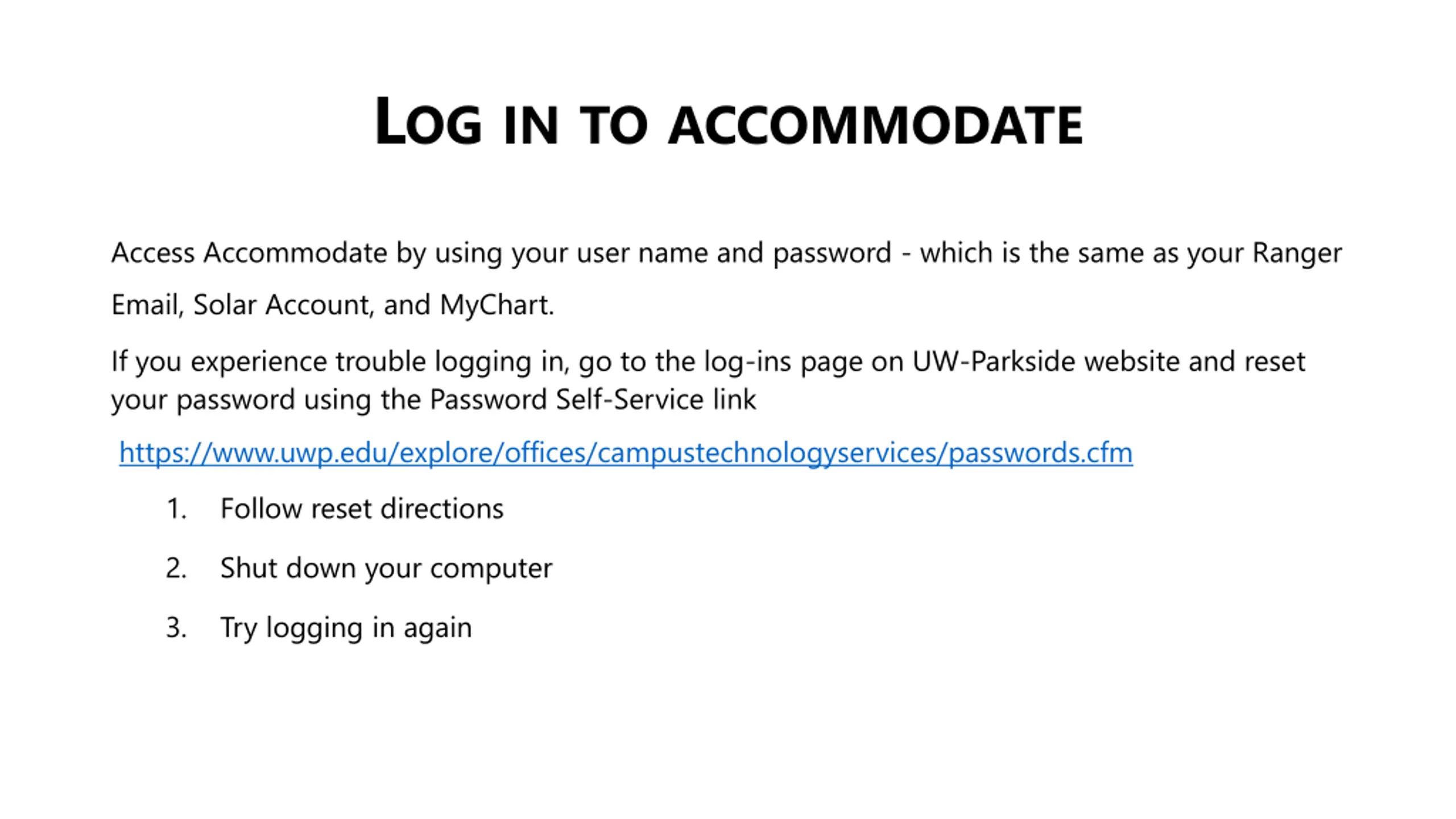 LOGINTOACCOMMODATE Access Accommodate by using your user name and password - which is the same as your Ranger Email, Solar Account, and MyChart. If you experience trouble logging in, go to the log-ins page on UW-Parkside website and reset your password using the Password Self-Service link https://www.uwp.edu/explore/offices/campustechnologyservices/passwords.cfm 1. Follow reset directions 2. Shut down your computer 3. Try logging in again