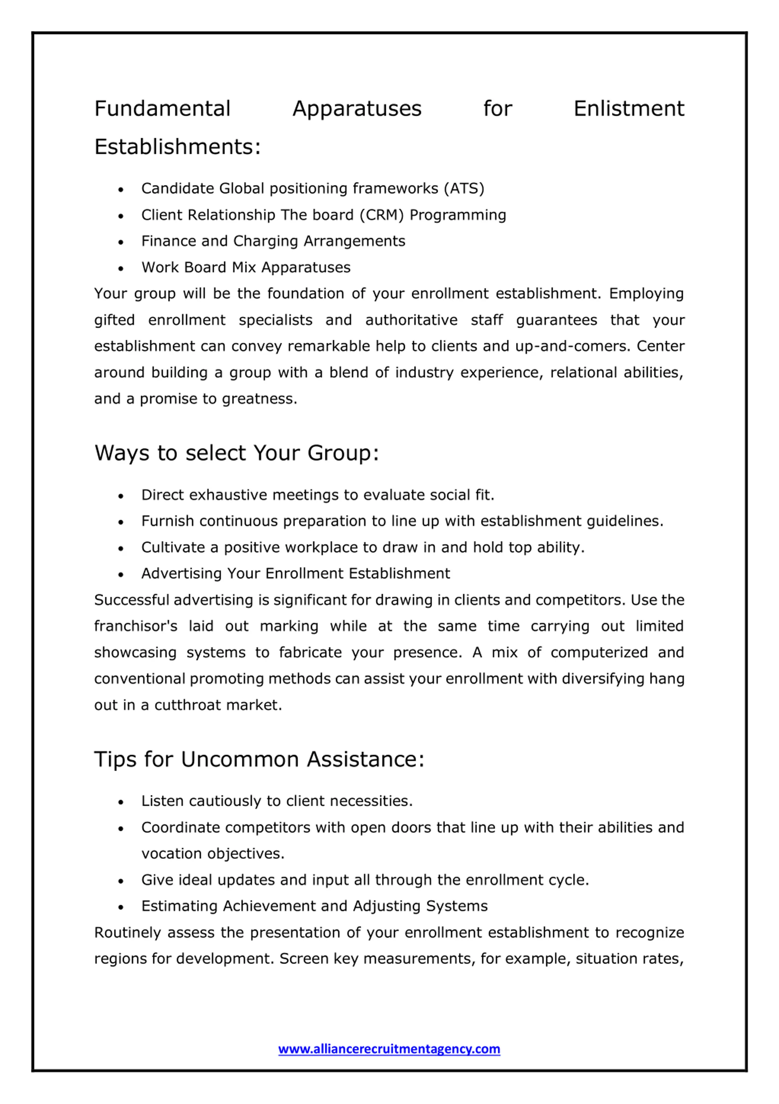 Fundamental Apparatuses for Enlistment Establishments: Candidate Global positioning frameworks (ATS) Client Relationship The board (CRM) Programming Finance and Charging Arrangements Work Board Mix Apparatuses Your group will be the foundation of your enrollment establishment. Employing gifted enrollment specialists and authoritative staff guarantees that your establishment can convey remarkable help to clients and up-and-comers. Center around building a group with a blend of industry experience, relational abilities, and a promise to greatness. Ways to select Your Group: Direct exhaustive meetings to evaluate social fit. Furnish continuous preparation to line up with establishment guidelines. Cultivate a positive workplace to draw in and hold top ability. Advertising Your Enrollment Establishment Successful advertising is significant for drawing in clients and competitors. Use the franchisor's laid out marking while at the same time carrying out limited showcasing systems to fabricate your presence. A mix of computerized and conventional promoting methods can assist your enrollment with diversifying hang out in a cutthroat market. Tips for Uncommon Assistance: Listen cautiously to client necessities. Coordinate competitors with open doors that line up with their abilities and vocation objectives. Give ideal updates and input all through the enrollment cycle. Estimating Achievement and Adjusting Systems Routinely assess the presentation of your enrollment establishment to recognize regions for development. Screen key measurements, for example, situation rates, www.alliancerecruitmentagency.com
