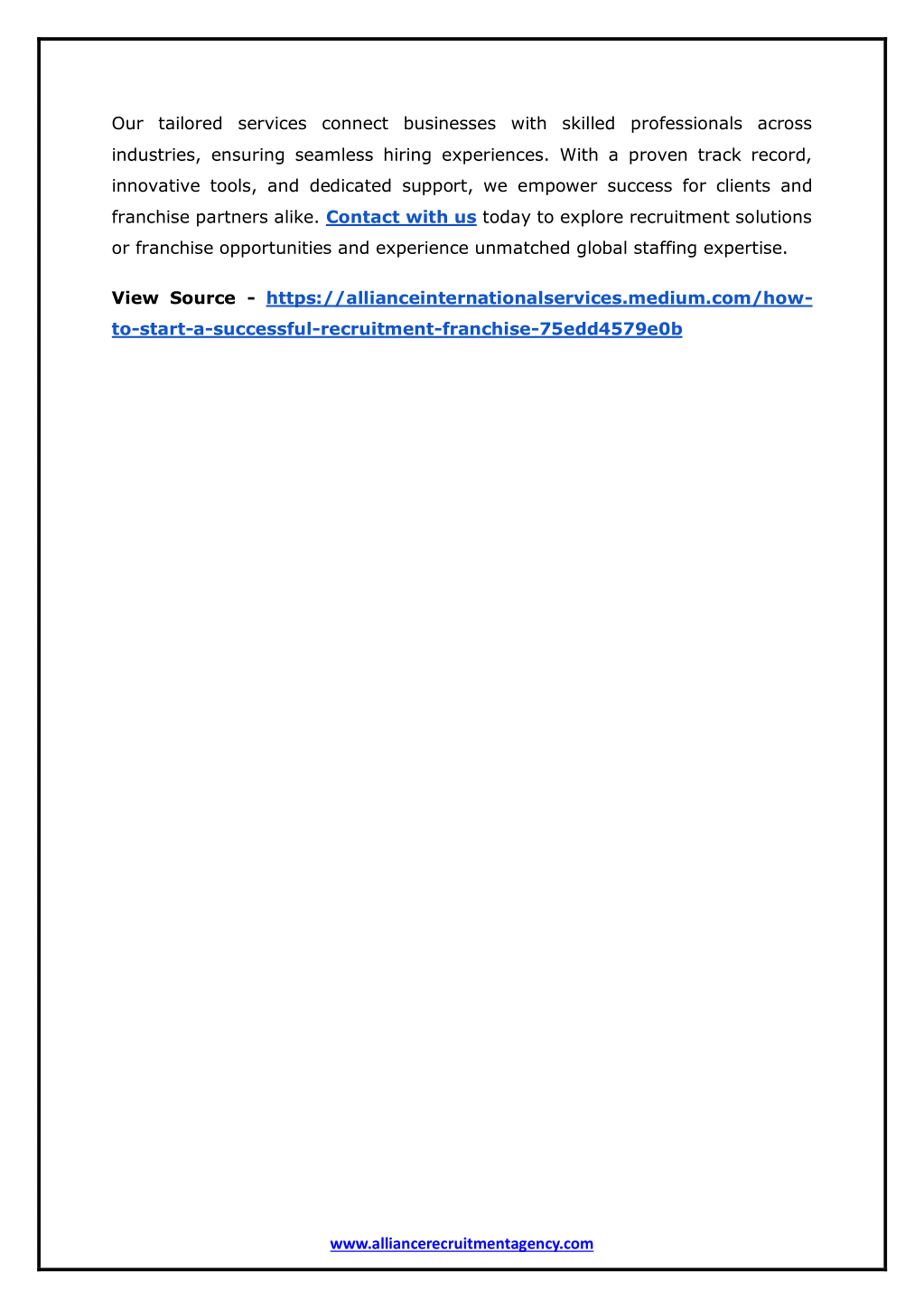 Our tailored services connect businesses with skilled professionals across industries, ensuring seamless hiring experiences. With a proven track record, innovative tools, and dedicated support, we empower success for clients and franchise partners alike. Contact with us today to explore recruitment solutions or franchise opportunities and experience unmatched global staffing expertise. View Source - https://allianceinternationalservices.medium.com/how- to-start-a-successful-recruitment-franchise-75edd4579e0b www.alliancerecruitmentagency.com