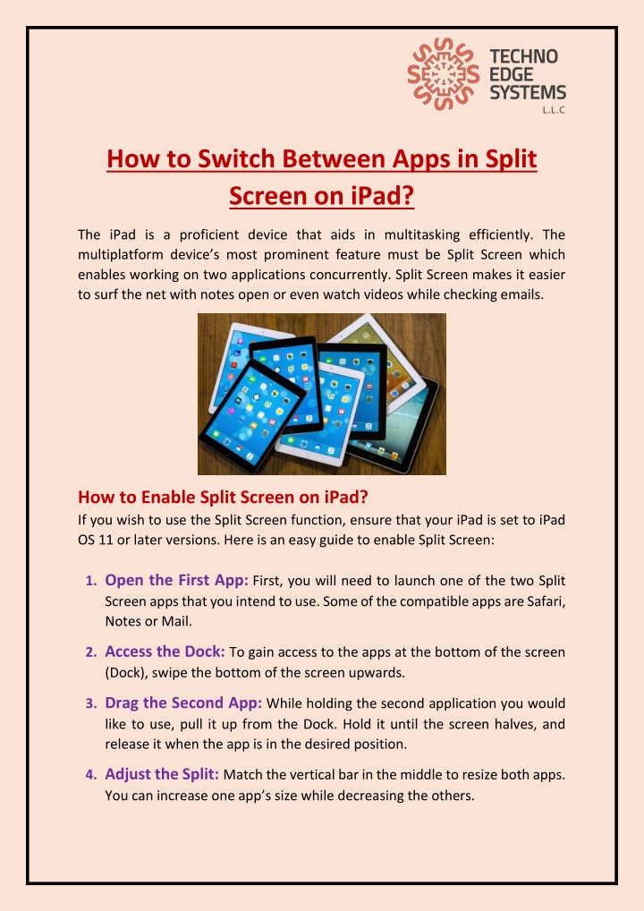 Throughout this PDF,How to Switch Between Apps in Split Screen on iPad? - from Techno Edge Systems LLC get iPad Rental in Dubai. for more info Call Us At 971-54-4653108.nVisit Us:// /