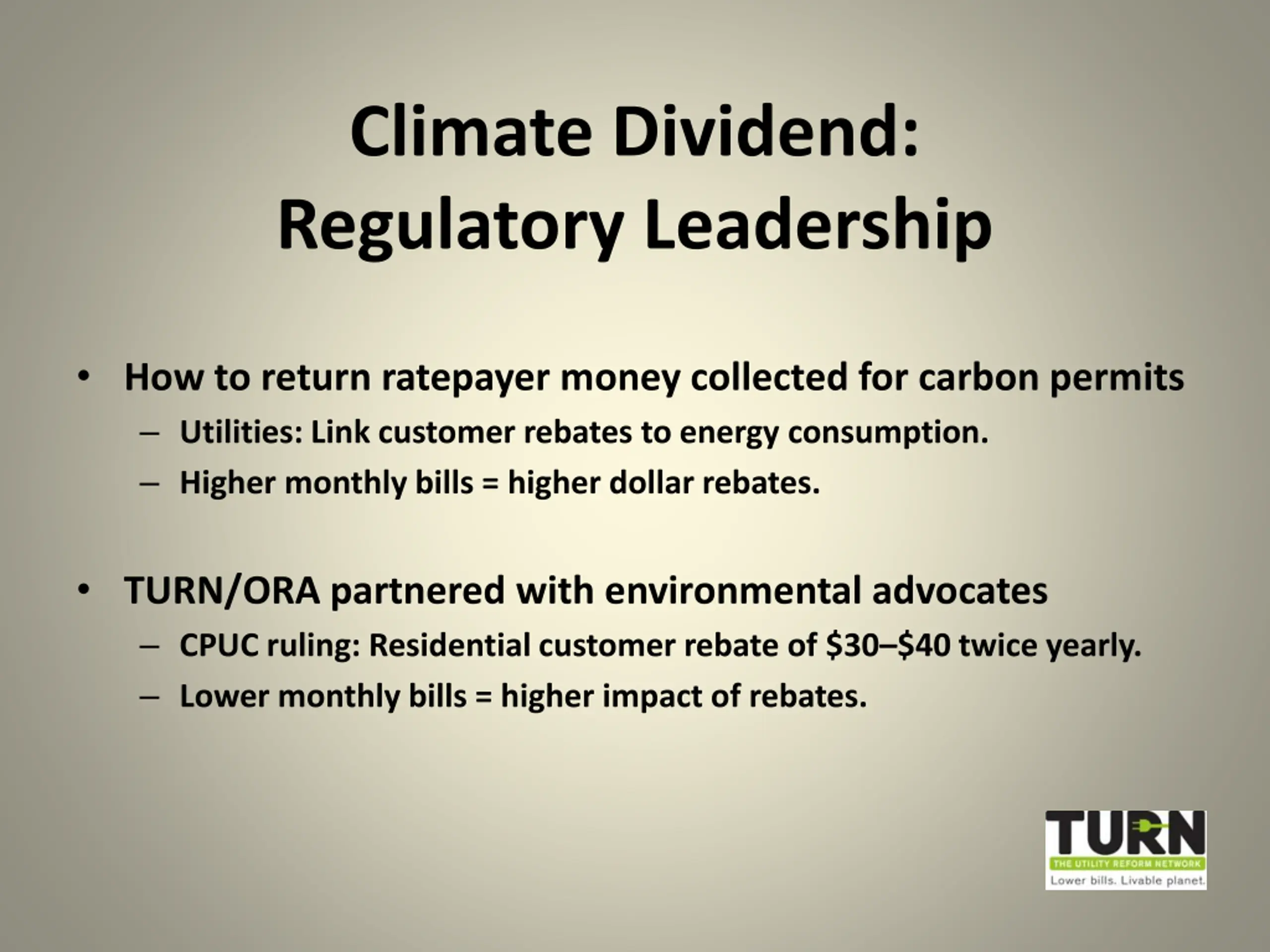 Climate Dividend: Regulatory Leadership How to return ratepayer money collected for carbon permits Utilities: Link customer rebates to energy consumption. Higher monthly bills = higher dollar rebates. TURN/ORA partnered with environmental advocates CPUC ruling: Residential customer rebate of $30 $40 twice yearly. Lower monthly bills = higher impact of rebates.
