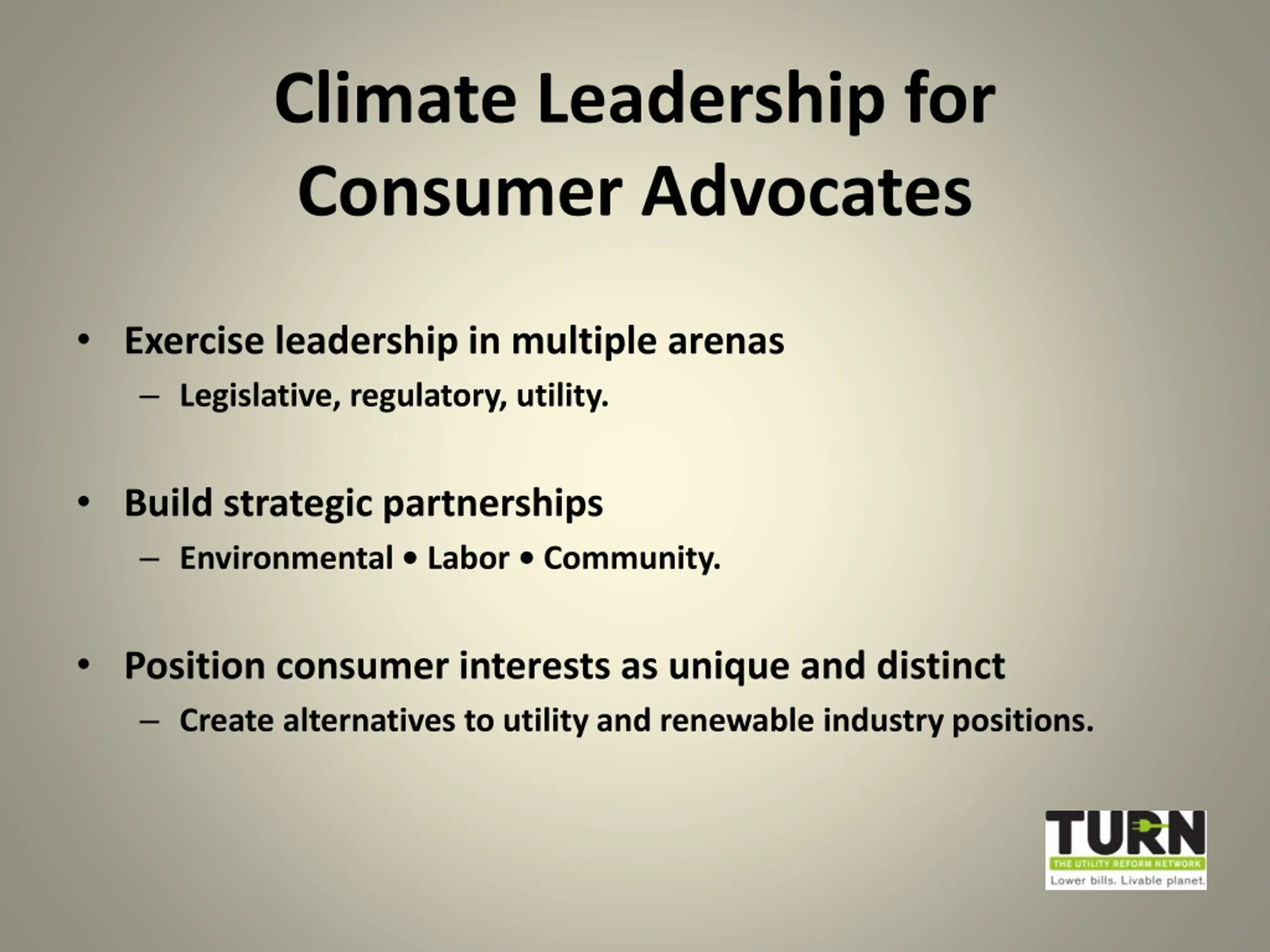 Climate Leadership for Consumer Advocates Exercise leadership in multiple arenas Legislative, regulatory, utility. Build strategic partnerships Environmental Labor Community. Position consumer interests as unique and distinct Create alternatives to utility and renewable industry positions.