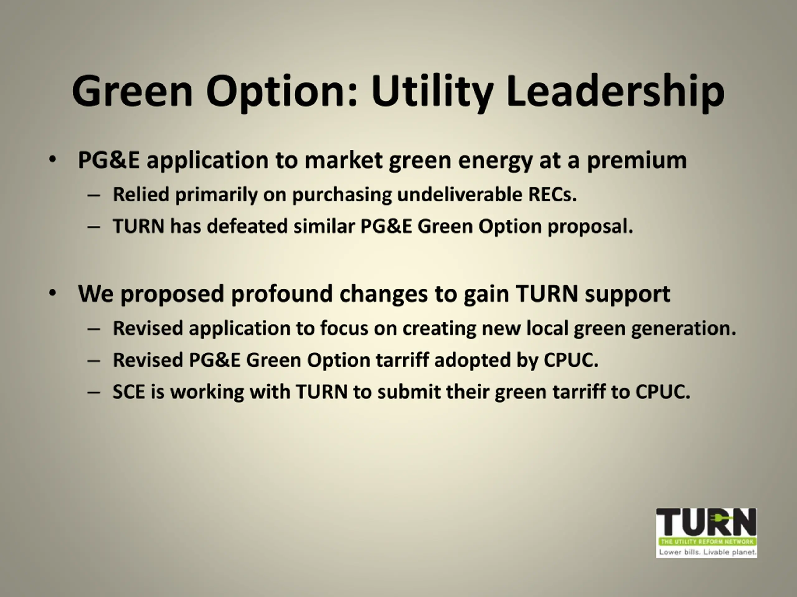 Green Option: Utility Leadership PG&E application to market green energy at a premium Relied primarily on purchasing undeliverable RECs. TURN has defeated similar PG&E Green Option proposal. We proposed profound changes to gain TURN support Revised application to focus on creating new local green generation. Revised PG&E Green Option tarriff adopted by CPUC. SCE is working with TURN to submit their green tarriff to CPUC.