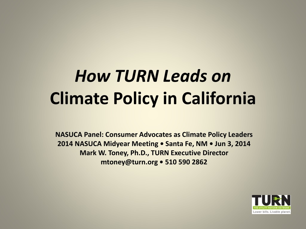 How TURN Leads on Climate Policy in California NASUCA Panel: Consumer Advocates as Climate Policy Leaders 2014 NASUCA Midyear Meeting Santa Fe, NM Jun 3, 2014 Mark W. Toney, Ph.D., TURN Executive Director mtoney@turn.org 510 590 2862