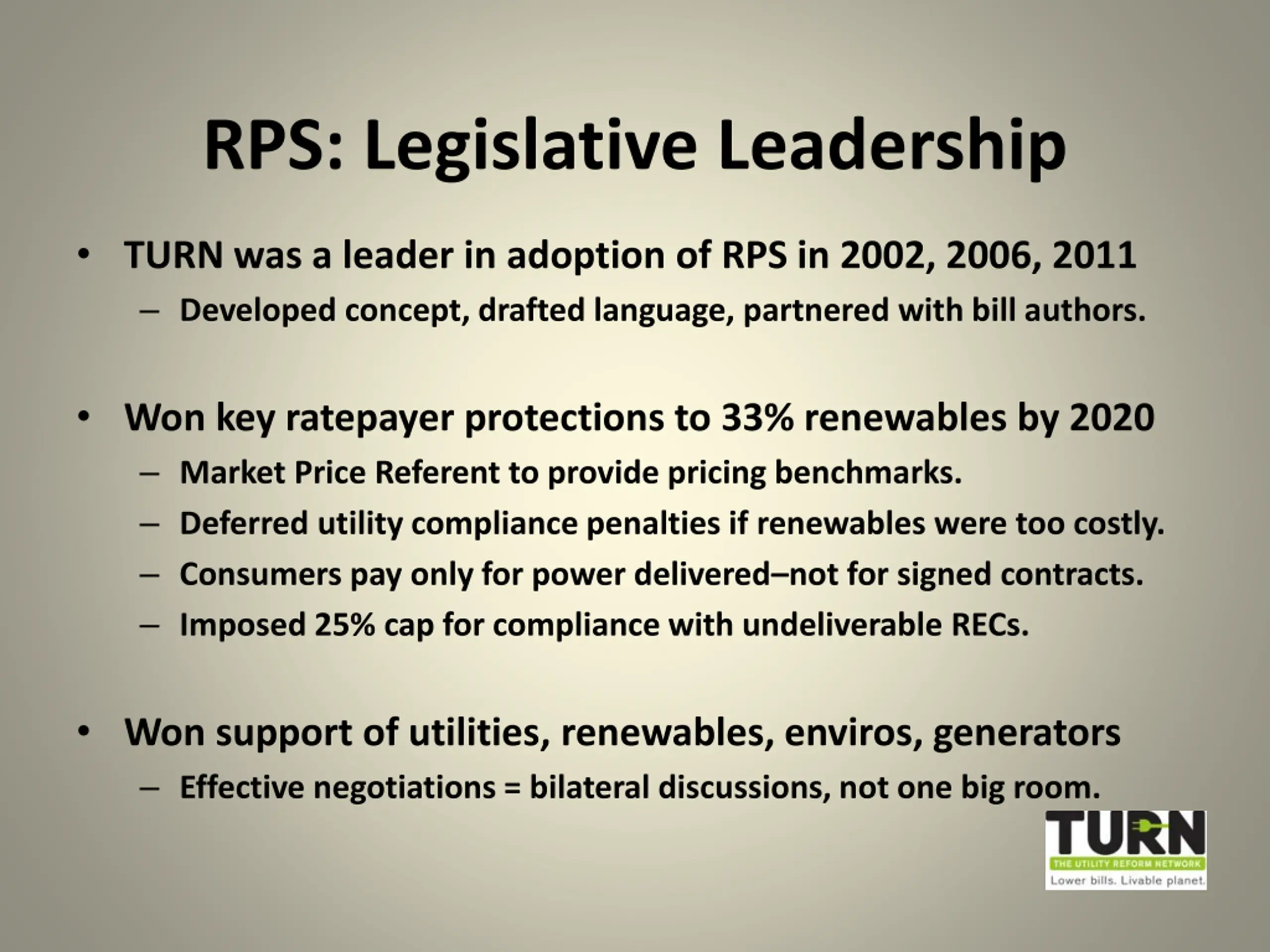 RPS: Legislative Leadership TURN was a leader in adoption of RPS in 2002, 2006, 2011 Developed concept, drafted language, partnered with bill authors. Won key ratepayer protections to 33% renewables by 2020 Market Price Referent to provide pricing benchmarks. Deferred utility compliance penalties if renewables were too costly. Consumers pay only for power delivered not for signed contracts. Imposed 25% cap for compliance with undeliverable RECs. Won support of utilities, renewables, enviros, generators Effective negotiations = bilateral discussions, not one big room.