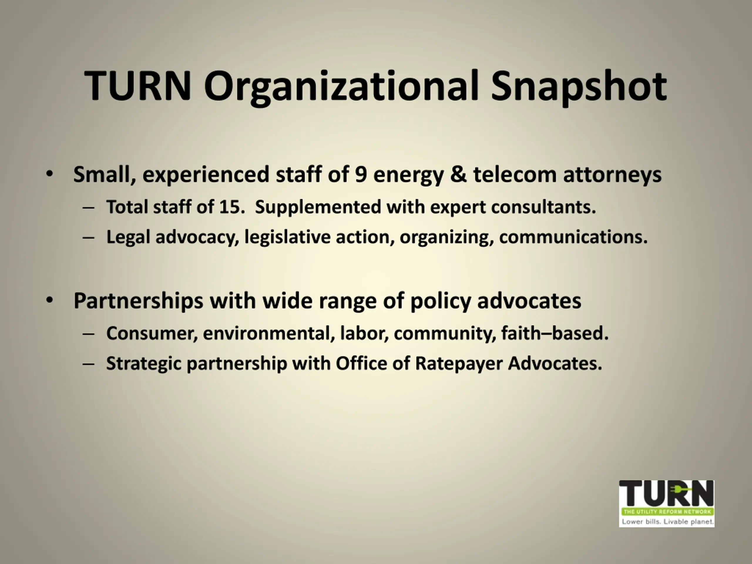 TURN Organizational Snapshot Small, experienced staff of 9 energy & telecom attorneys Total staff of 15. Supplemented with expert consultants. Legal advocacy, legislative action, organizing, communications. Partnerships with wide range of policy advocates Consumer, environmental, labor, community, faith based. Strategic partnership with Office of Ratepayer Advocates.