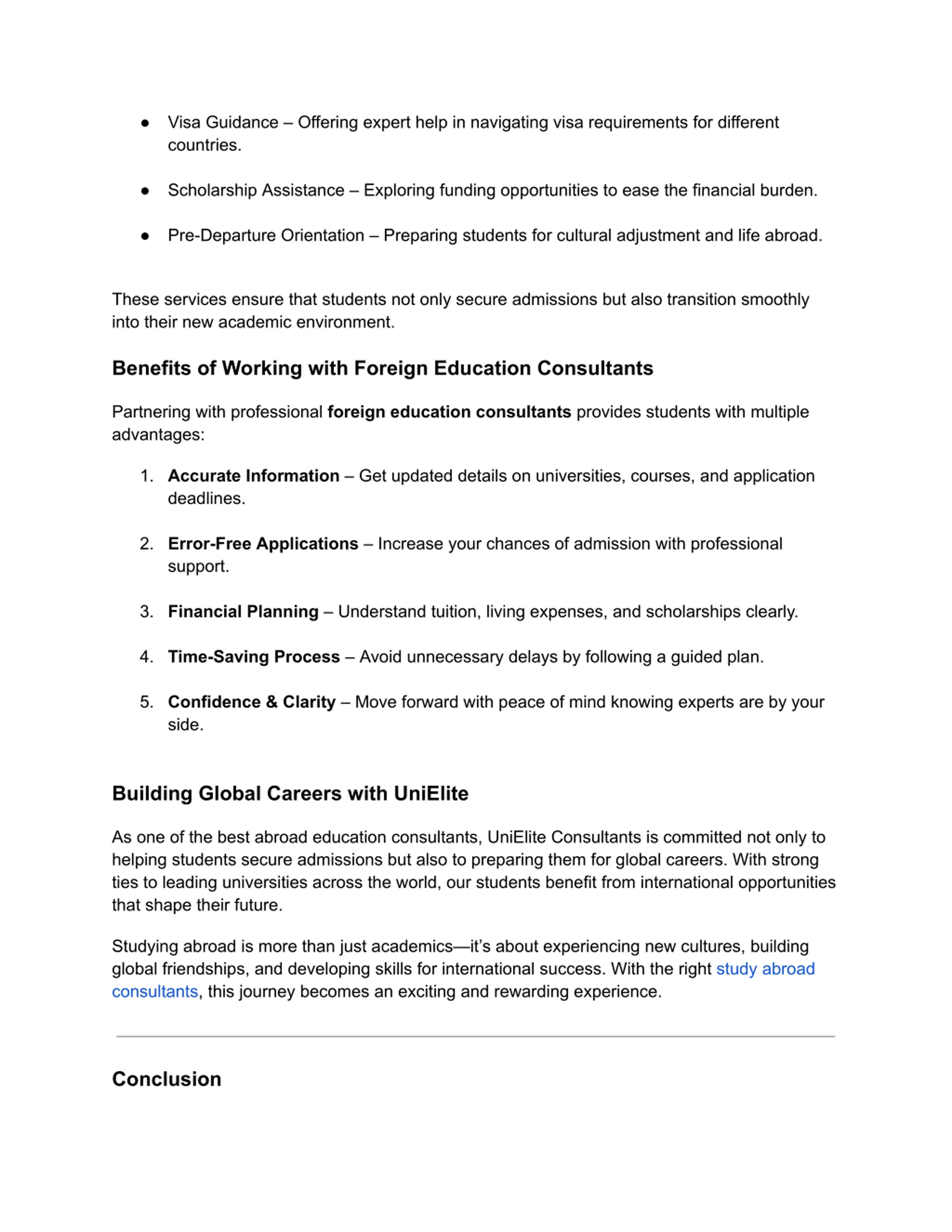 Visa Guidance Offering expert help in navigating visa requirements for different countries. Scholarship Assistance Exploring funding opportunities to ease the financial burden. Pre-Departure Orientation Preparing students for cultural adjustment and life abroad. These services ensure that students not only secure admissions but also transition smoothly into their new academic environment. Benefits of Working with Foreign Education Consultants Partnering with professional foreign education consultants provides students with multiple advantages: 1. Accurate Information Get updated details on universities, courses, and application deadlines. 2. Error-Free Applications Increase your chances of admission with professional support. 3. Financial Planning Understand tuition, living expenses, and scholarships clearly. 4. Time-Saving Process Avoid unnecessary delays by following a guided plan. 5. Confidence & Clarity Move forward with peace of mind knowing experts are by your side. Building Global Careers with UniElite As one of the best abroad education consultants, UniElite Consultants is committed not only to helping students secure admissions but also to preparing them for global careers. With strong ties to leading universities across the world, our students benefit from international opportunities that shape their future. Studying abroad is more than just academics it s about experiencing new cultures, building global friendships, and developing skills for international success. With the right study abroad consultants , this journey becomes an exciting and rewarding experience. Conclusion