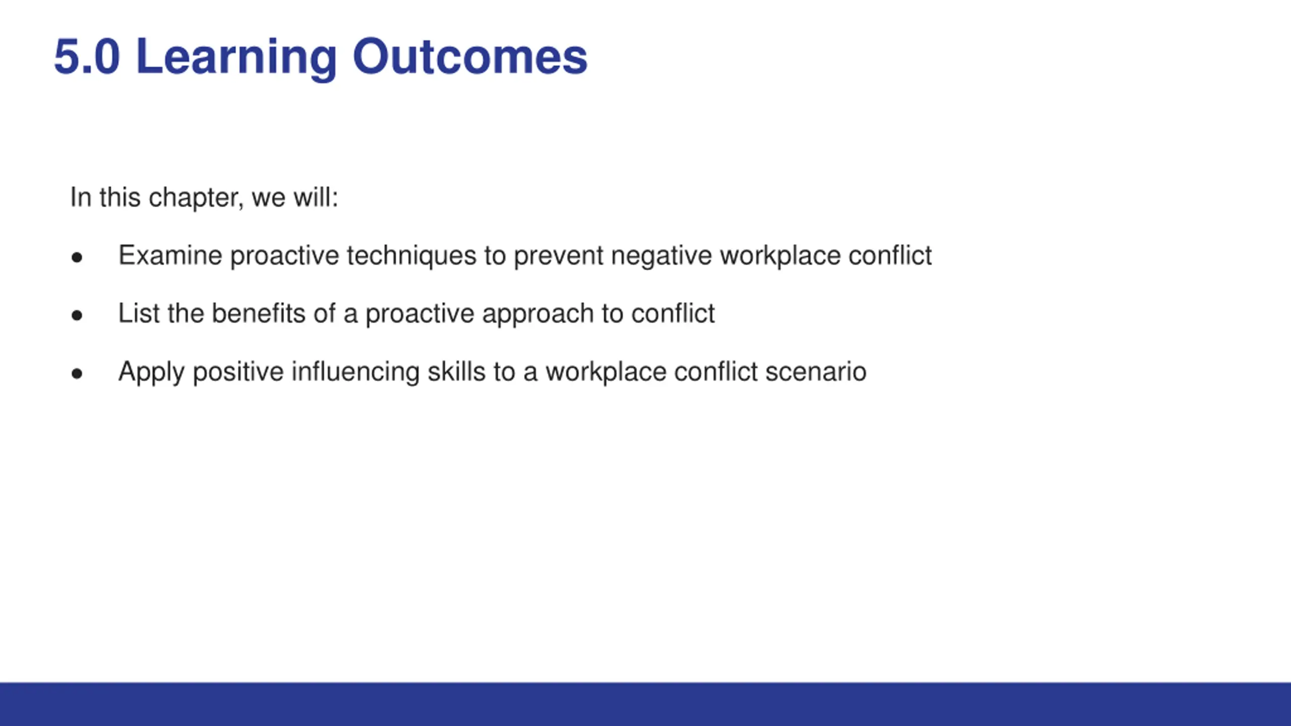 5.0 Learning Outcomes In this chapter, we will: Examine proactive techniques to prevent negative workplace conflict List the benefits of a proactive approach to conflict Apply positive influencing skills to a workplace conflict scenario