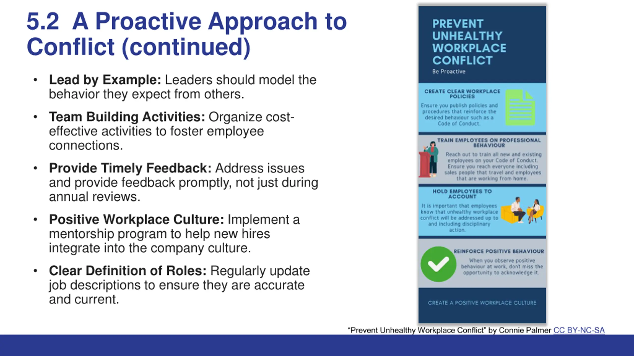 5.2 A Proactive Approach to Conflict (continued) Lead by Example: Leaders should model the behavior they expect from others. Team Building Activities: Organize cost- effective activities to foster employee connections. Provide Timely Feedback: Address issues and provide feedback promptly, not just during annual reviews. Positive Workplace Culture: Implement a mentorship program to help new hires integrate into the company culture. Clear Definition of Roles: Regularly update job descriptions to ensure they are accurate and current. Prevent Unhealthy Workplace Conflict by Connie Palmer CC BY-NC-SA