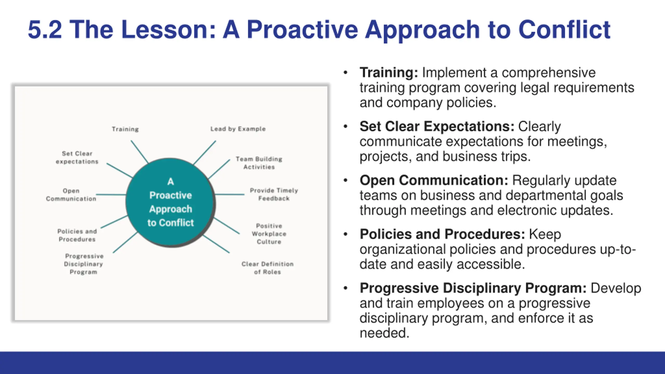 5.2 The Lesson: A Proactive Approach to Conflict Training: Implement a comprehensive training program covering legal requirements and company policies. Set Clear Expectations: Clearly communicate expectations for meetings, projects, and business trips. Open Communication: Regularly update teams on business and departmental goals through meetings and electronic updates. Policies and Procedures: Keep organizational policies and procedures up-to- date and easily accessible. Progressive Disciplinary Program: Develop and train employees on a progressive disciplinary program, and enforce it as needed.