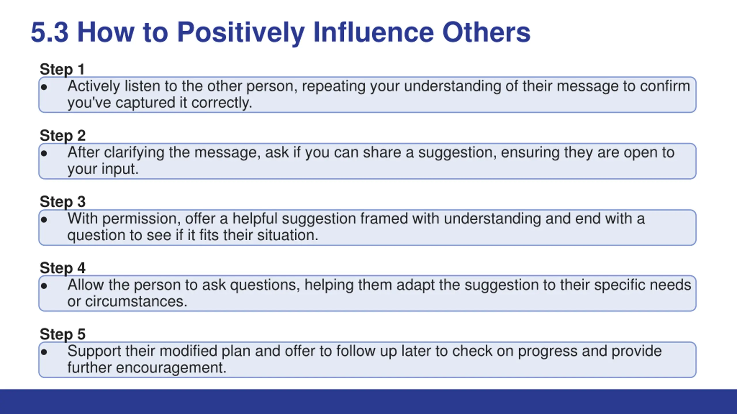 5.3 How to Positively Influence Others Step 1 Actively listen to the other person, repeating your understanding of their message to confirm you've captured it correctly. Step 2 After clarifying the message, ask if you can share a suggestion, ensuring they are open to your input. Step 3 With permission, offer a helpful suggestion framed with understanding and end with a question to see if it fits their situation. Step 4 Allow the person to ask questions, helping them adapt the suggestion to their specific needs or circumstances. Step 5 Support their modified plan and offer to follow up later to check on progress and provide further encouragement.