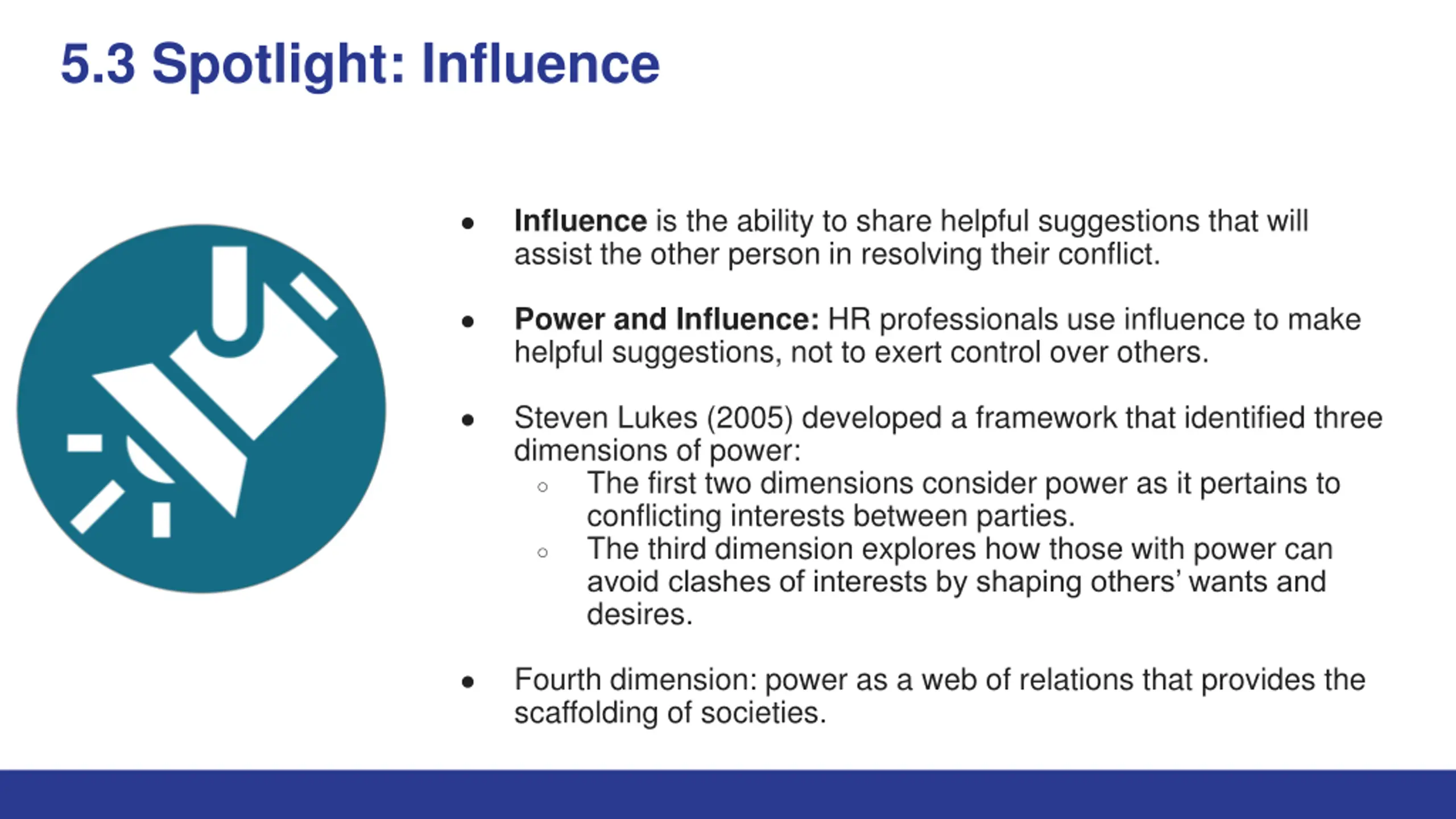5.3 Spotlight: Influence Influence is the ability to share helpful suggestions that will assist the other person in resolving their conflict. Power and Influence: HR professionals use influence to make helpful suggestions, not to exert control over others. Steven Lukes (2005) developed a framework that identified three dimensions of power: The first two dimensions consider power as it pertains to conflicting interests between parties. The third dimension explores how those with power can avoid clashes of interests by shaping others wants and desires. Fourth dimension: power as a web of relations that provides the scaffolding of societies.