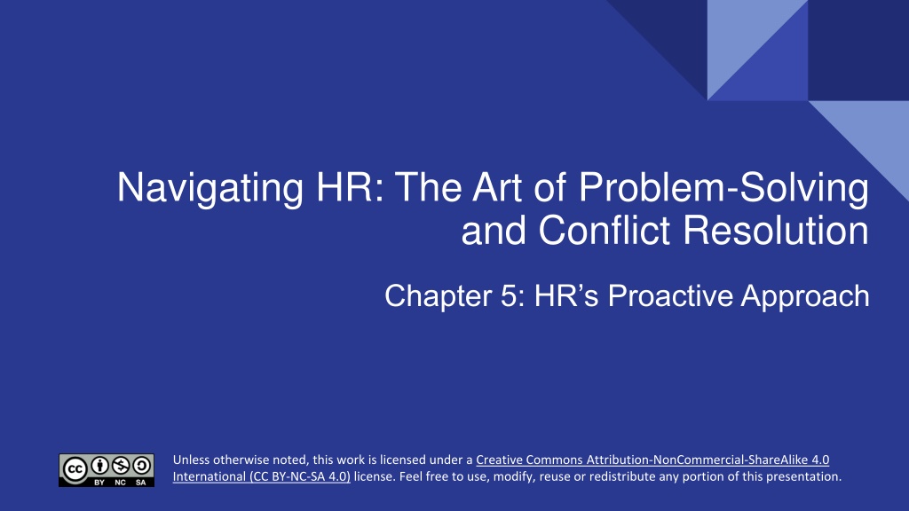 Navigating HR: The Art of Problem-Solving and Conflict Resolution Chapter 5: HR s Proactive Approach Creative Commons Attribution-NonCommercial-ShareAlike 4.0 International (CC BY-NC-SA 4.0) Creative Commons Attribution-NonCommercial-ShareAlike 4.0 International (CC BY-NC-SA 4.0) Unless otherwise noted, this work is licensed under a Creative Commons Attribution-NonCommercial-ShareAlike 4.0 International (CC BY-NC-SA 4.0) license. Feel free to use, modify, reuse or redistribute any portion of this presentation.