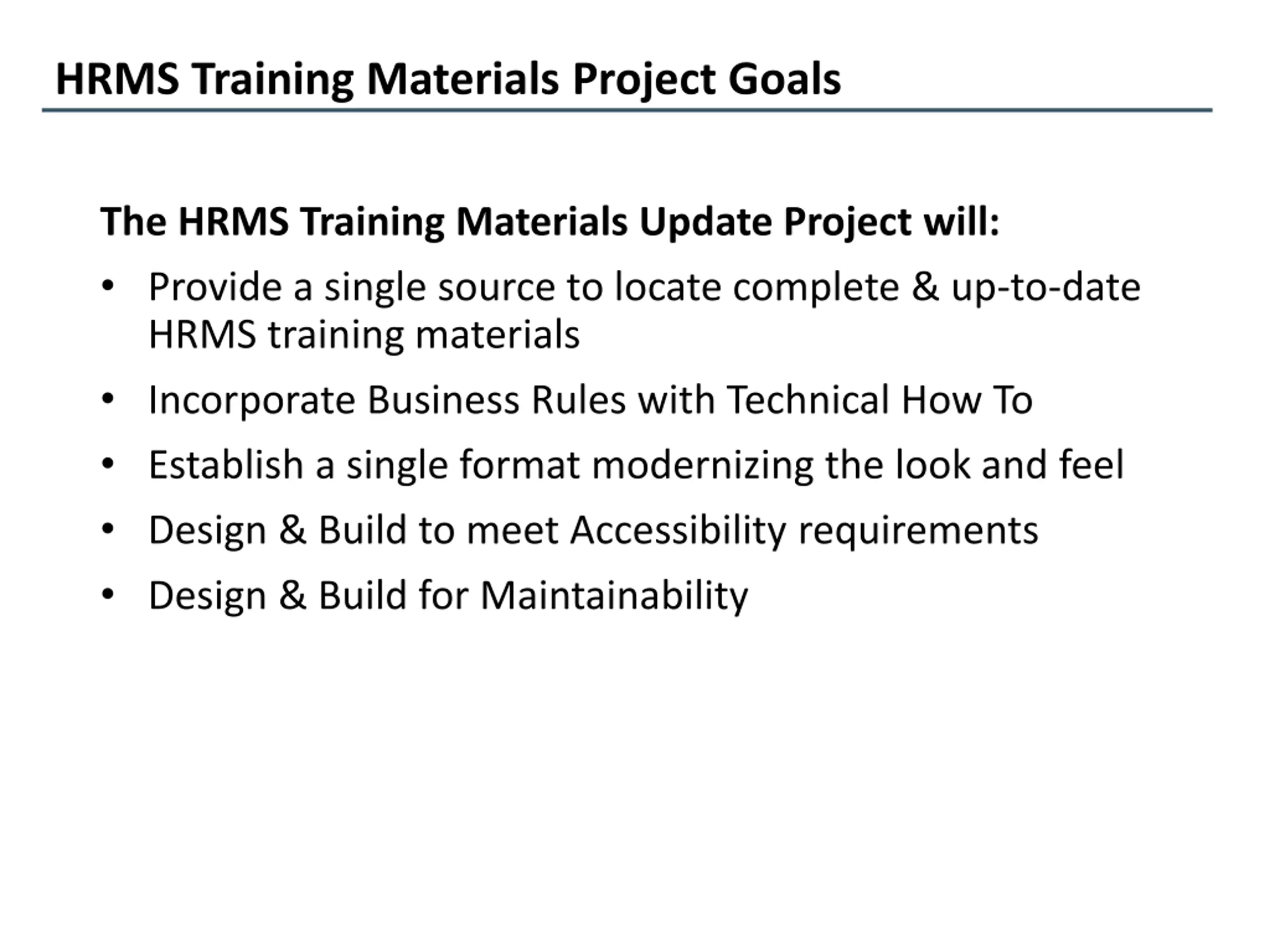 HRMS Training Materials Project Goals The HRMS Training Materials Update Project will: Provide a single source to locate complete & up-to-date HRMS training materials Incorporate Business Rules with Technical How To Establish a single format modernizing the look and feel Design & Build to meet Accessibility requirements Design & Build for Maintainability