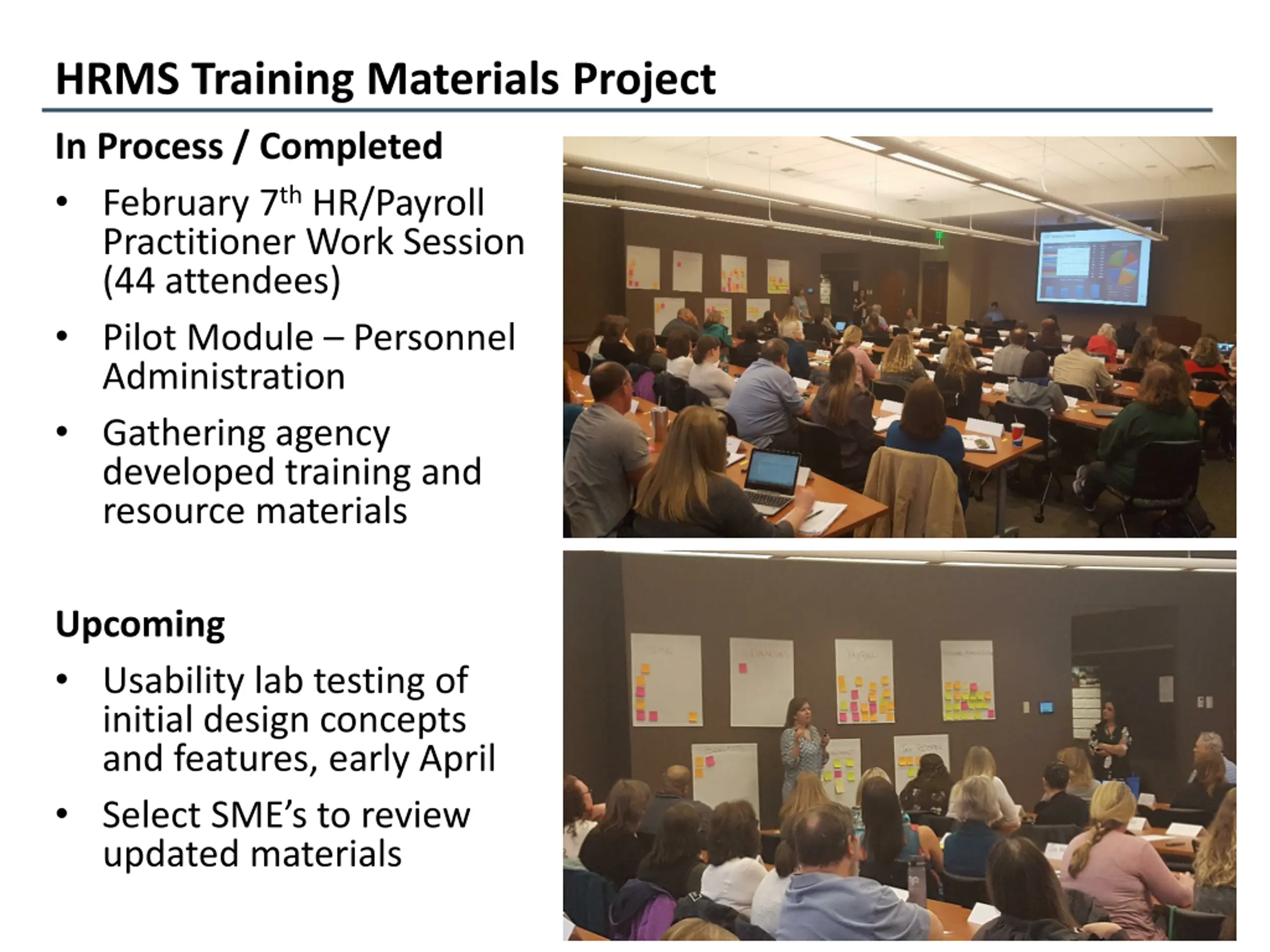 HRMS Training Materials Project In Process / Completed February 7th HR/Payroll Practitioner Work Session (44 attendees) Pilot Module Personnel Administration Gathering agency developed training and resource materials Upcoming Usability lab testing of initial design concepts and features, early April Select SME s to review updated materials