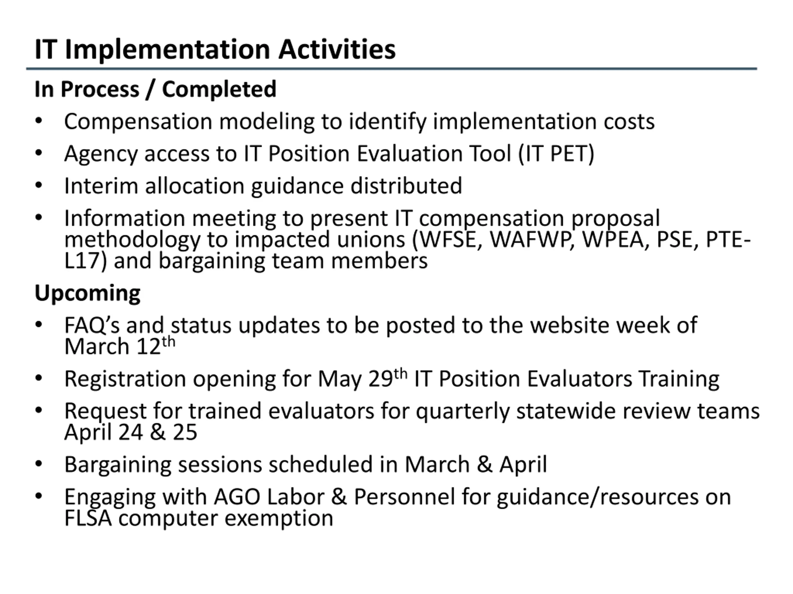 IT Implementation Activities In Process / Completed Compensation modeling to identify implementation costs Agency access to IT Position Evaluation Tool (IT PET) Interim allocation guidance distributed Information meeting to present IT compensation proposal methodology to impacted unions (WFSE, WAFWP, WPEA, PSE, PTE- L17) and bargaining team members Upcoming FAQ s and status updates to be posted to the website week of March 12th Registration opening for May 29th IT Position Evaluators Training Request for trained evaluators for quarterly statewide review teams April 24 & 25 Bargaining sessions scheduled in March & April Engaging with AGO Labor & Personnel for guidance/resources on FLSA computer exemption