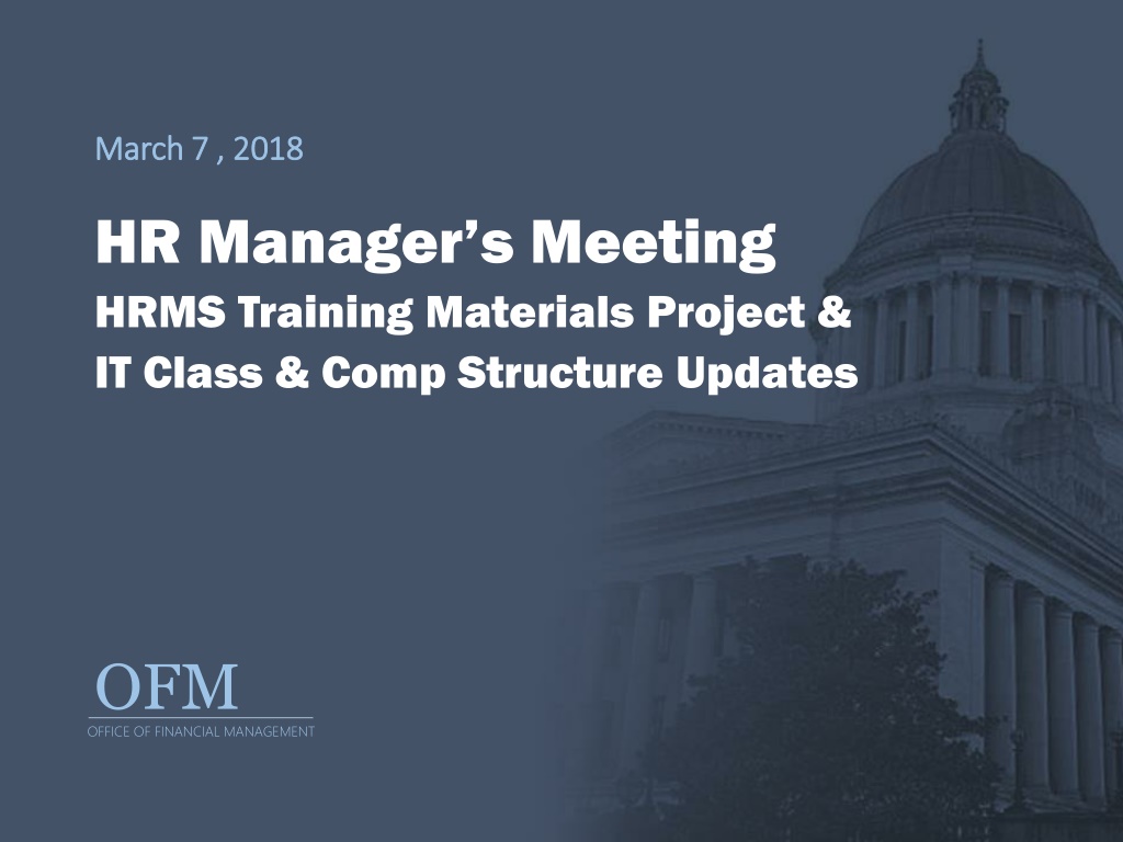 March March 7 7 , 2018 , 2018 HR Manager s Meeting HRMS Training Materials Project & IT Class & Comp Structure Updates OFM OFFICE OF FINANCIAL MANAGEMENT