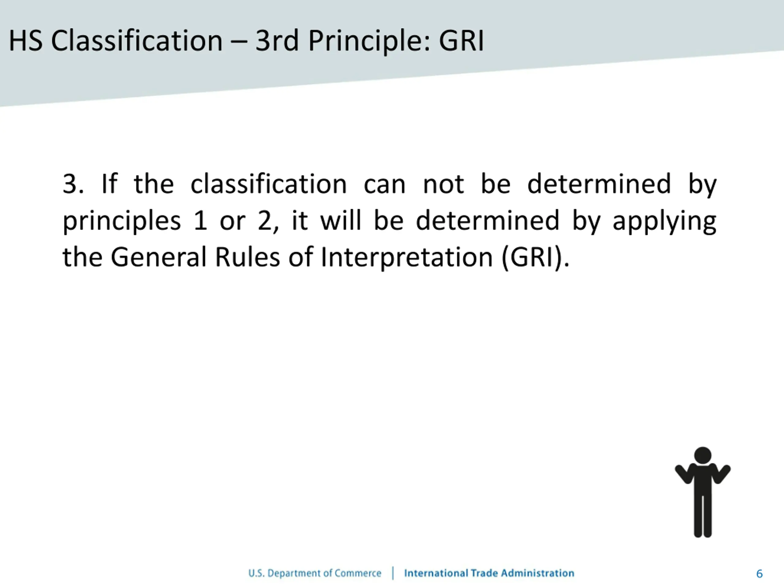HS Classification 3rd Principle: GRI 3. If the classification can not be determined by principles 1 or 2, it will be determined by applying the General Rules of Interpretation (GRI). 6