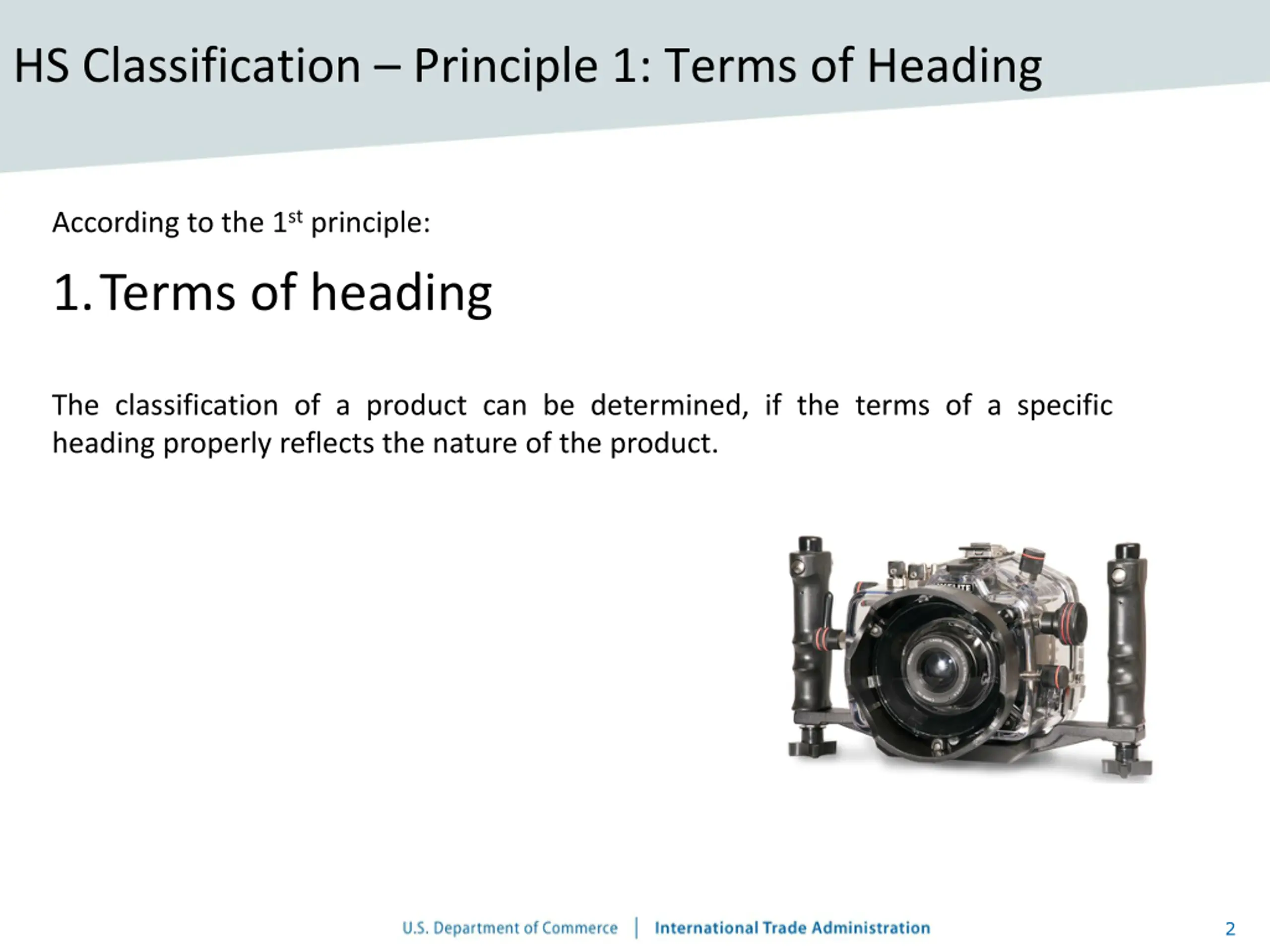 HS Classification Principle 1: Terms of Heading According to the 1st principle: 1.Terms of heading The classification of a product can be determined, if the terms of a specific heading properly reflects the nature of the product. 2