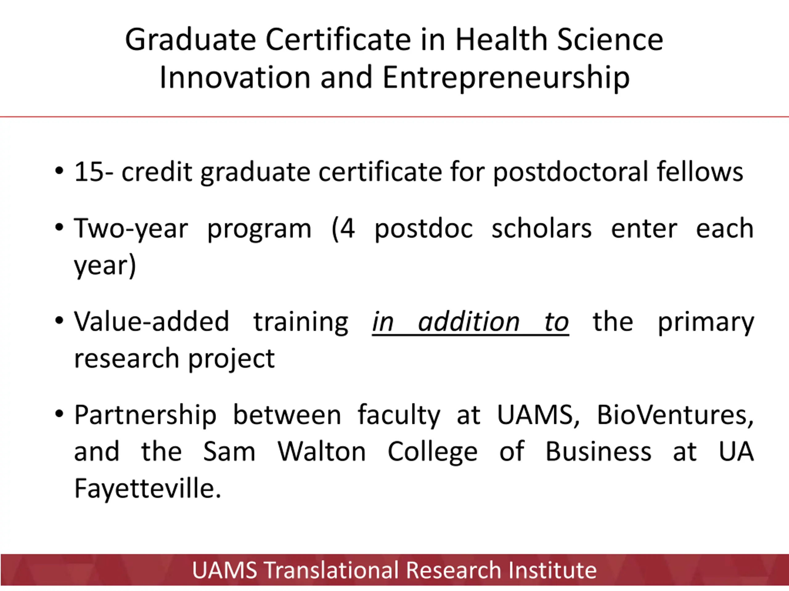 Graduate Certificate in Health Science Innovation and Entrepreneurship 15- credit graduate certificate for postdoctoral fellows Two-year program (4 postdoc scholars enter each year) Value-added training in addition to the primary research project Partnership between faculty at UAMS, BioVentures, and the Sam Walton College of Business at UA Fayetteville. UAMS Translational Research Institute