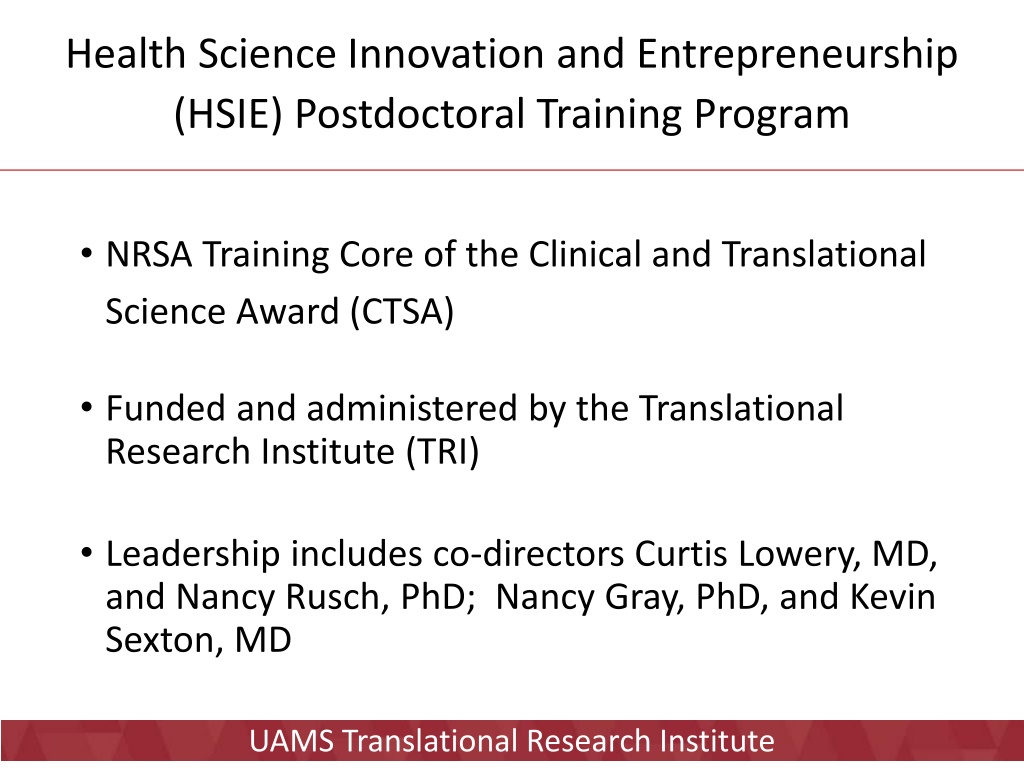 Health Science Innovation and Entrepreneurship (HSIE) Postdoctoral Training Program NRSA Training Core of the Clinical and Translational Science Award (CTSA) Funded and administered by the Translational Research Institute (TRI) Leadership includes co-directors Curtis Lowery, MD, and Nancy Rusch, PhD; Nancy Gray, PhD, and Kevin Sexton, MD UAMS Translational Research Institute