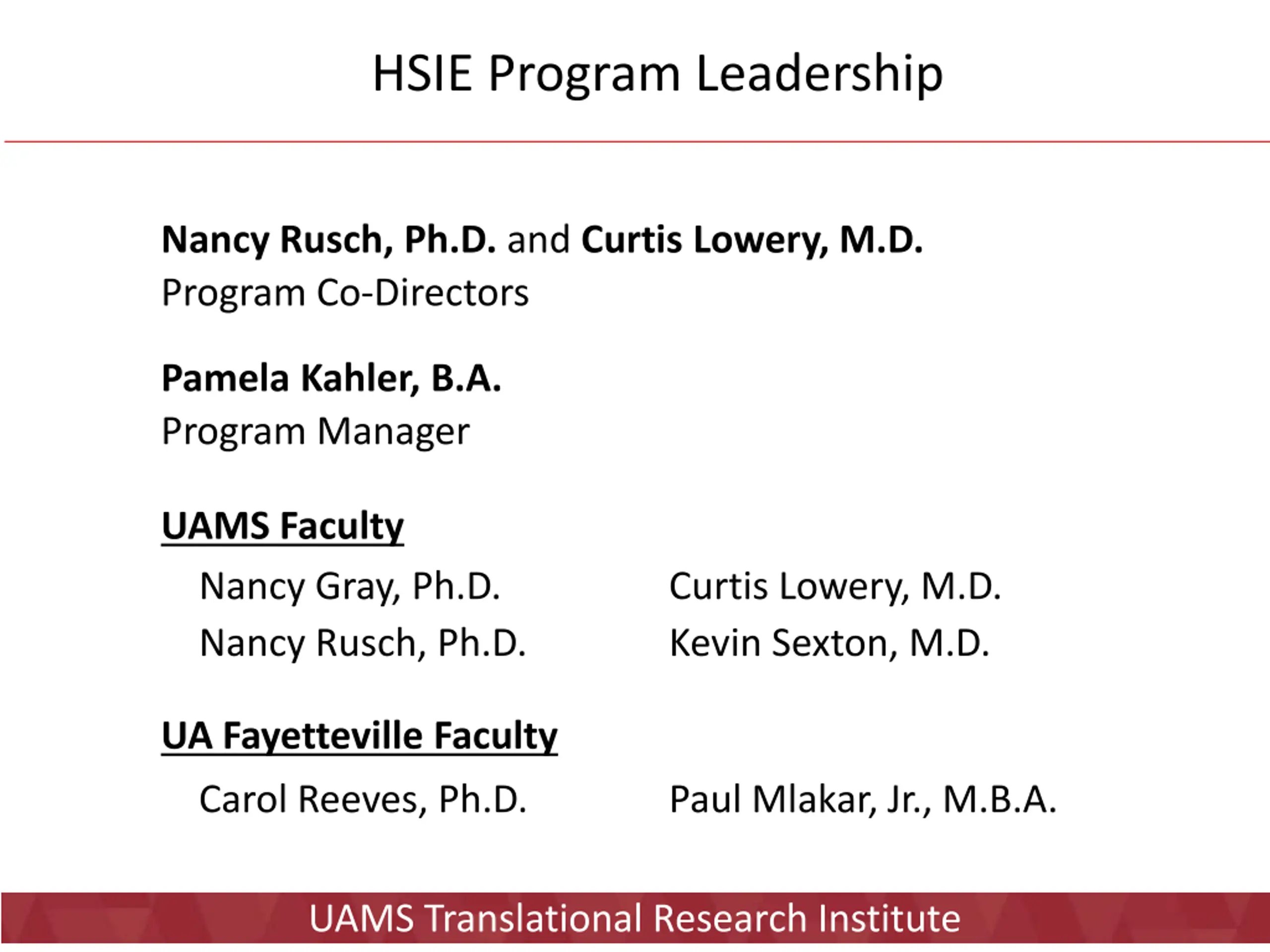 HSIE Program Leadership Nancy Rusch, Ph.D. and Curtis Lowery, M.D. Program Co-Directors Pamela Kahler, B.A. Program Manager UAMS Faculty Nancy Gray, Ph.D. Nancy Rusch, Ph.D. Curtis Lowery, M.D. Kevin Sexton, M.D. UA Fayetteville Faculty Carol Reeves, Ph.D. Paul Mlakar, Jr., M.B.A. UAMS Translational Research Institute